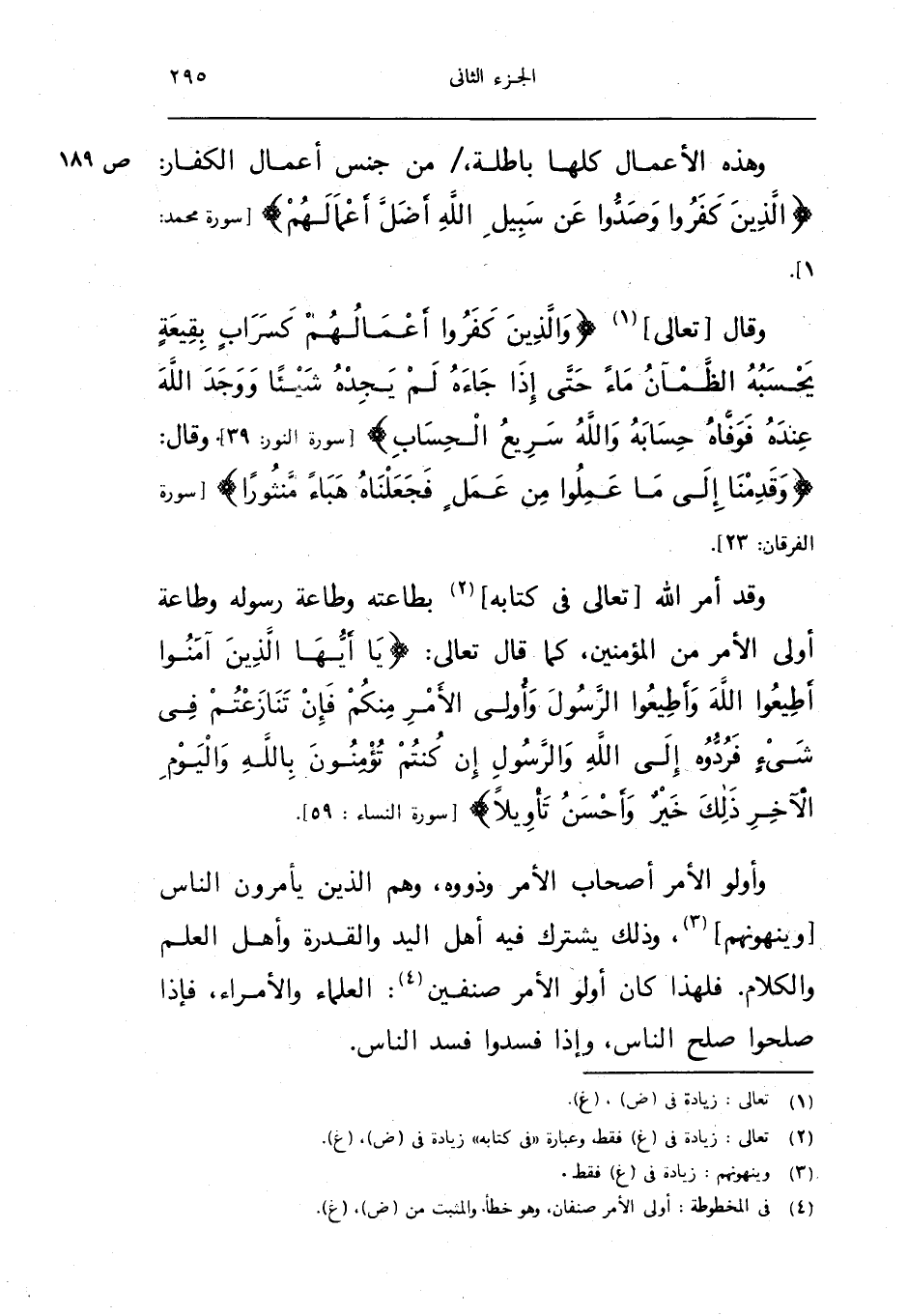 وَقد امْر الله تَعَالَى فِي كِتَابه بِطَاعَتِهِ وَطَاعَة رَسُوله وَطَاعَة اولي الْأَمر من الْمُؤمنِينَ كَمَا قَالَ تَعَالَى {يَا أَيهَا الَّذين آمنُوا أطِيعُوا الله وَأَطيعُوا الرَّسُول وأولي الْأَمر مِنْكُم فَإِن تنازعتم فِي شَيْء فَردُّوهُ إِلَى الله وَالرَّسُول إِن كُنْتُم تؤمنون بِاللَّه وَالْيَوْم الآخر ذَلِك خير وَأحسن تَأْوِيلا} سُورَة النِّسَاء 59