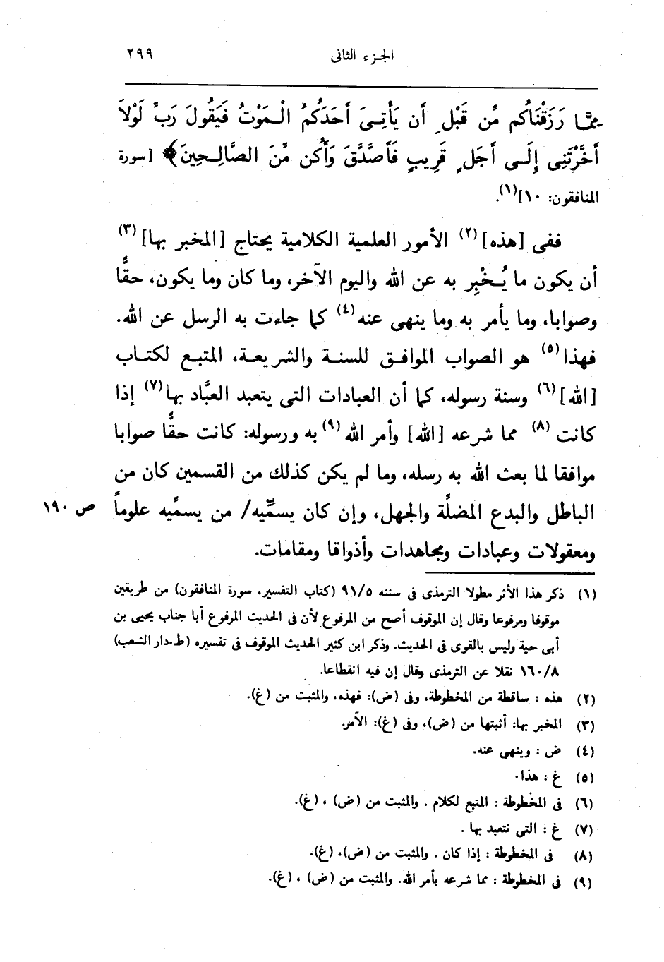 فَفِي هَذِه الامور العلمية الكلامية يحْتَاج الْمخبر بهَا ان يكون مَا يخبر بِهِ عَن الله وَالْيَوْم الاخر وَمَا كَانَ وَمَا يكون حَقًا وصوابا وَمَا يَأْمر بِهِ وَمَا يُنْهِي عَنهُ كَمَا جَاءَت بِهِ الرُّسُل عَن الله فَهَذَا هُوَ الصَّوَاب الْمُوَافق للسّنة والشريعة المتبع لكتاب الله وَسنة رَسُوله كَمَا ان الْعِبَادَات الَّتِي يتعبد الْعباد بهَا اذا كَانَت مِمَّا شرعة الله وامر الله بِهِ وَرَسُوله كَانَت حَقًا صَوَابا مُوَافقا لما بعث الله بِهِ رسله وَمَا لم يكن كَذَلِك من الْقسمَيْنِ كَانَ من الْبَاطِل والبدع المضلة وَالْجهل وان كَانَ يُسَمِّيه من يُسَمِّيه علوما ومعقولات وعبادات ومجاهدات واذواقا ومقامات