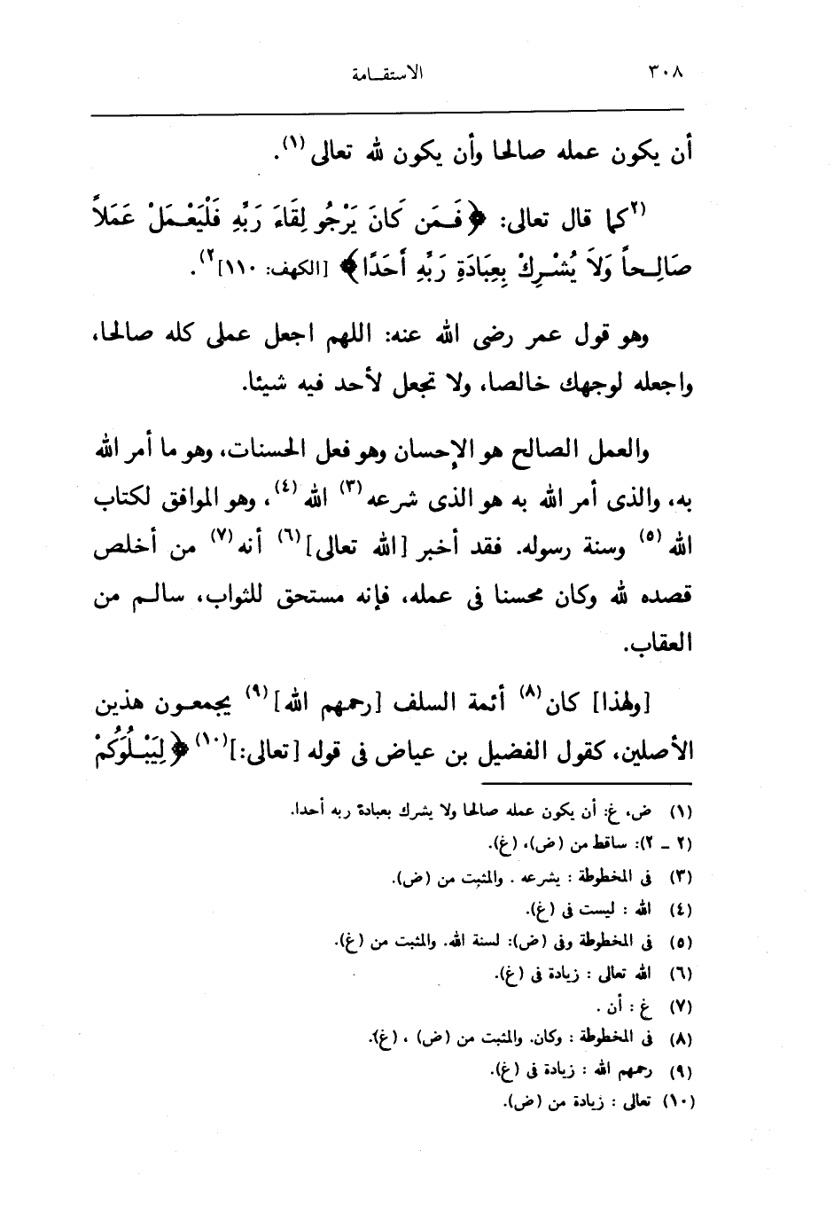 وَلِهَذَا كَانَ ائمة السّلف رَحِمهم الله يجمعُونَ هذَيْن الاصلين كَقَوْل الفضيل بن عِيَاض فِي قَوْله تَعَالَى {ليَبْلُوكُمْ}