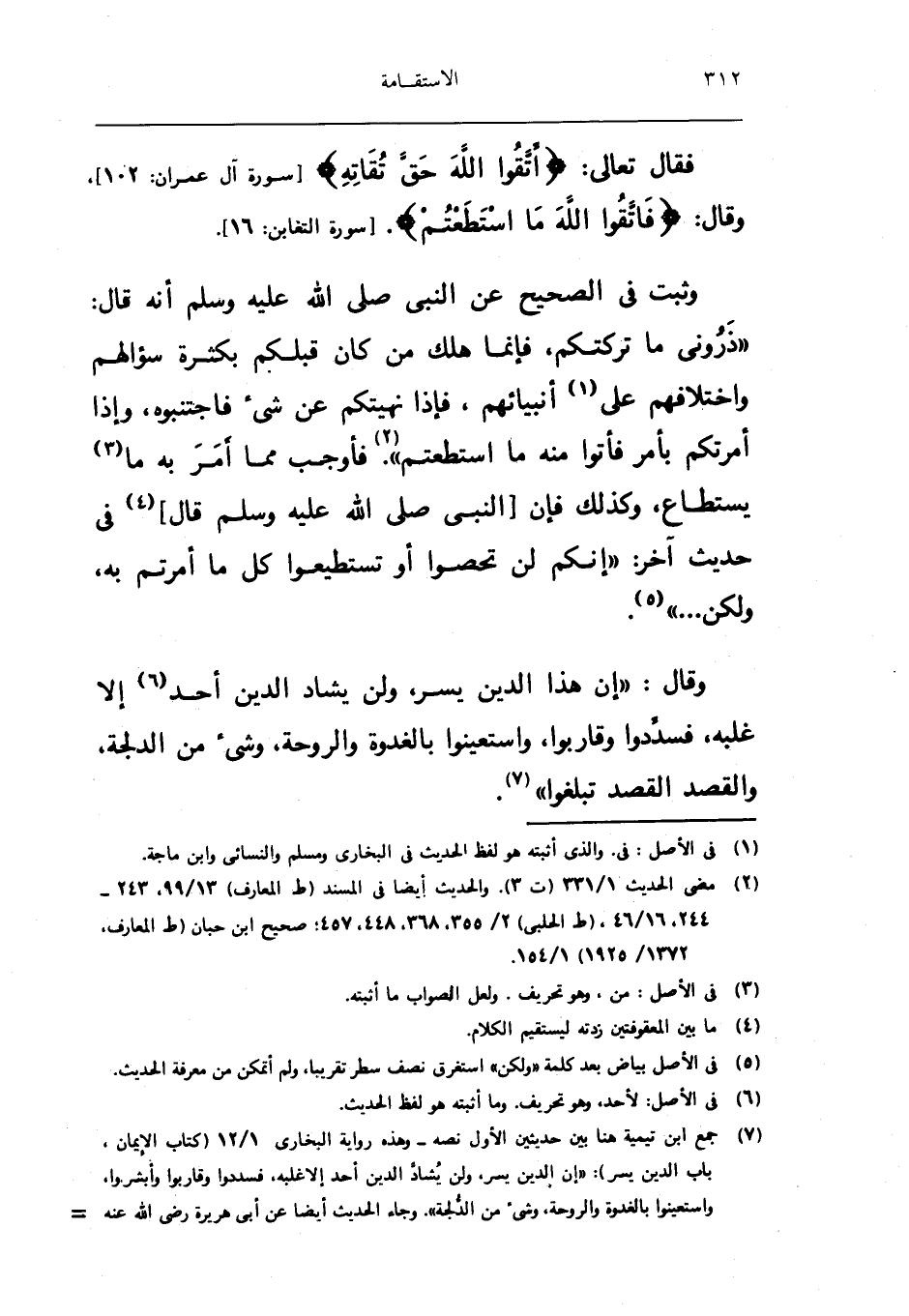 وَثَبت فِي الصَّحِيح عَن النَّبِي صلى الله عَلَيْهِ وَسلم انه قَالَ ذروني مَا تركتكم فَإِنَّمَا هلك من كَانَ قبلكُمْ بِكَثْرَة سُؤَالهمْ وَاخْتِلَافهمْ على انبيائهم فَإِذا نَهَيْتُكُمْ عَن شَيْء فَاجْتَنبُوهُ واذا امرتكم بِأَمْر فَأتوا مِنْهُ مَا اسْتَطَعْتُم فَأوجب مِمَّا امْر بِهِ مَا يُسْتَطَاع وَكَذَلِكَ فَإِن النَّبِي صلى الله عَلَيْهِ وَسلم قَالَ فِي حَدِيث اخر انكم لن تُحْصُوا اَوْ تستطيعوا كل مَا امرتم بِهِ وَلَكِن