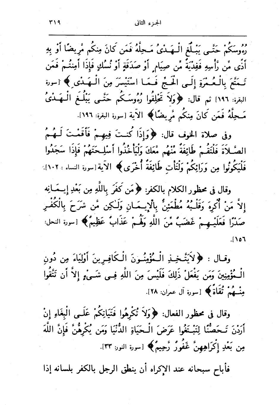 وَقَالَ فِي مَحْظُور الْكَلَام بالْكفْر {من كفر بِاللَّه من بعد إيمَانه إِلَّا من أكره وَقَلبه مطمئن بِالْإِيمَان وَلَكِن من شرح بالْكفْر صَدرا فَعَلَيْهِم غضب من الله وَلَهُم عَذَاب عَظِيم} سُورَة النَّحْل 156