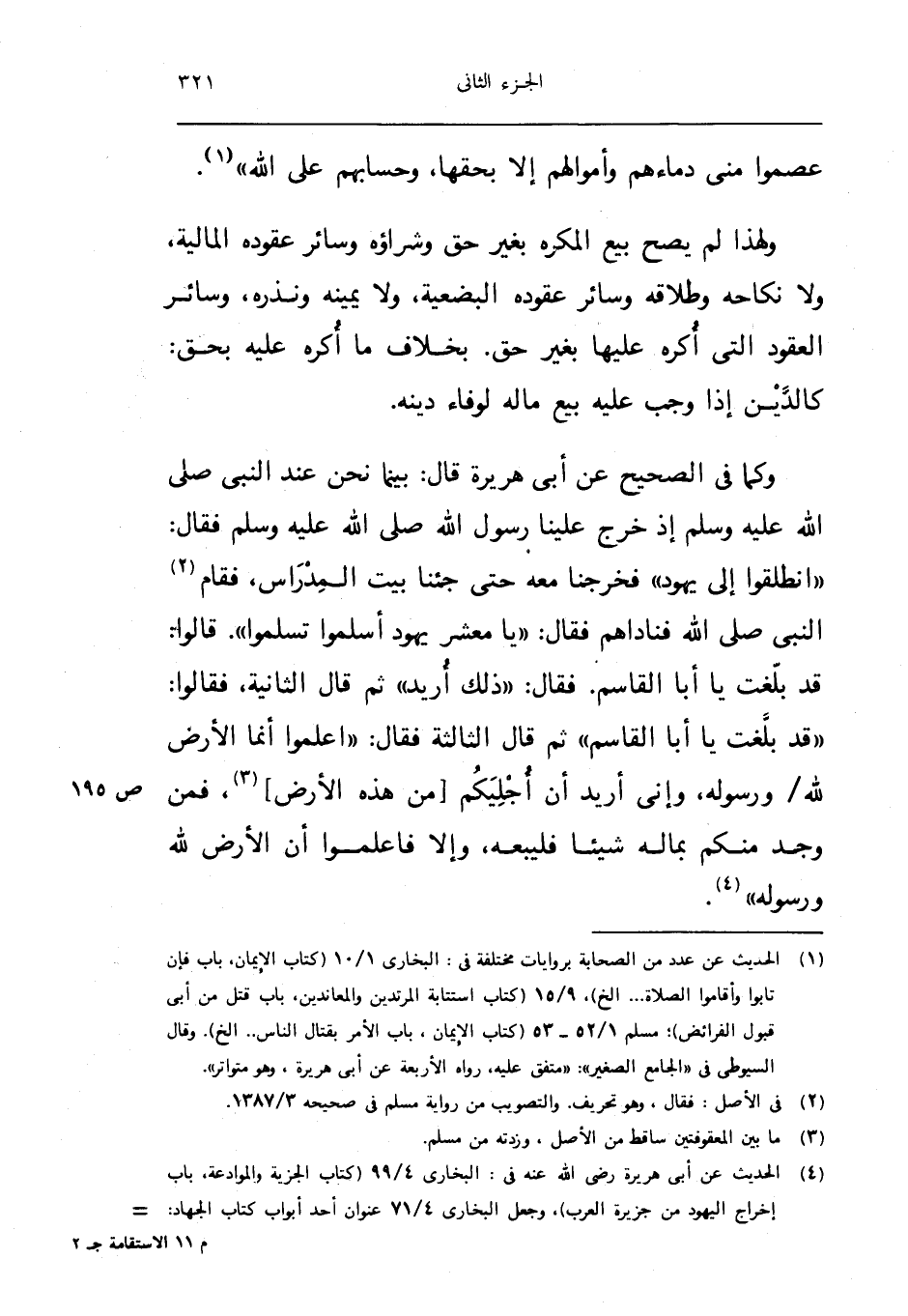 وكما فِي الصَّحِيح عَن ابي هُرَيْرَة قَالَ بَيْنَمَا نَحن عِنْد النَّبِي صلى الله عَلَيْهِ وَسلم اذ خرج علينا رَسُول الله صلى الله عَلَيْهِ وَسلم فَقَالَ انْطَلقُوا الى يهود فخرجنا مَعَه حَتَّى جِئْنَا بَيت الْمدَارِس فَقَامَ النَّبِي صلى الله عَلَيْهِ وَسلم فناداهم فَقَالَ يَا معشر يهود اسلموا يسلمُوا قَالُوا قد بلغت يَا ابا الْقَاسِم فَقَالَ ذَلِك اريد ثمَّ قَالَ الثَّانِيَة فَقَالُوا قد بلغت يَا ابا الْقَاسِم ثمَّ قَالَ الثَّالِثَة فَقَالَ اعلموا انما الارض لله وَرَسُوله واني اريد ان اجليكم من هَذِه الارض فَمن وجد مِنْكُم بِمَالِه شَيْئا فليبعه والا فاعلموا ان الارض لله وَرَسُوله
