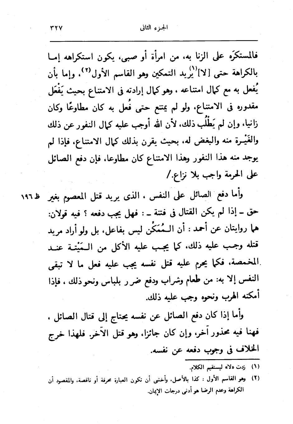 فالمستكره على الزِّنَا بِهِ من امْرَأَة اَوْ صبي يكون استكراهه اما بِالْكَرَاهَةِ حَتَّى لَا يُرِيد التَّمْكِين وَهُوَ الْقَاسِم الاول واما بِأَن يفعل بِهِ مَعَ كَمَال امْتِنَاعه وَهُوَ كَمَال ارادته فِي الِامْتِنَاع بِحَيْثُ يفعل مقدوره فِي الِامْتِنَاع وَلَو لم يمْتَنع حَتَّى فعل بِهِ كَانَ مطاوعا وَكَانَ زَانيا وان لم يطْلب ذَلِك لَان الله اوجب عَلَيْهِ كَمَال النفور عَن ذَلِك والغيرة مِنْهُ والبغض لَهُ بِحَيْثُ يقرن بذلك كَمَال الِامْتِنَاع فَإِذا لم يُوجد مِنْهُ هَذَا النفور وَهَذَا الِامْتِنَاع كَانَ مطاوعا فان دفع الصَّائِل على الْحُرْمَة وَاجِب بِلَا نزاع