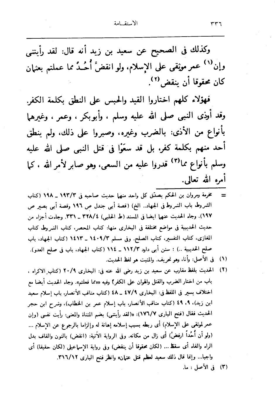 وَكَذَلِكَ فِي الصَّحِيح عَن سعيد بن زيد انه قَالَ لقد رَأَيْتنِي وان عمر موثقي على الاسلام وَلَو انقض اُحْدُ مِمَّا عملتم بعثمان كَانَ محقوقا ان ينْقض