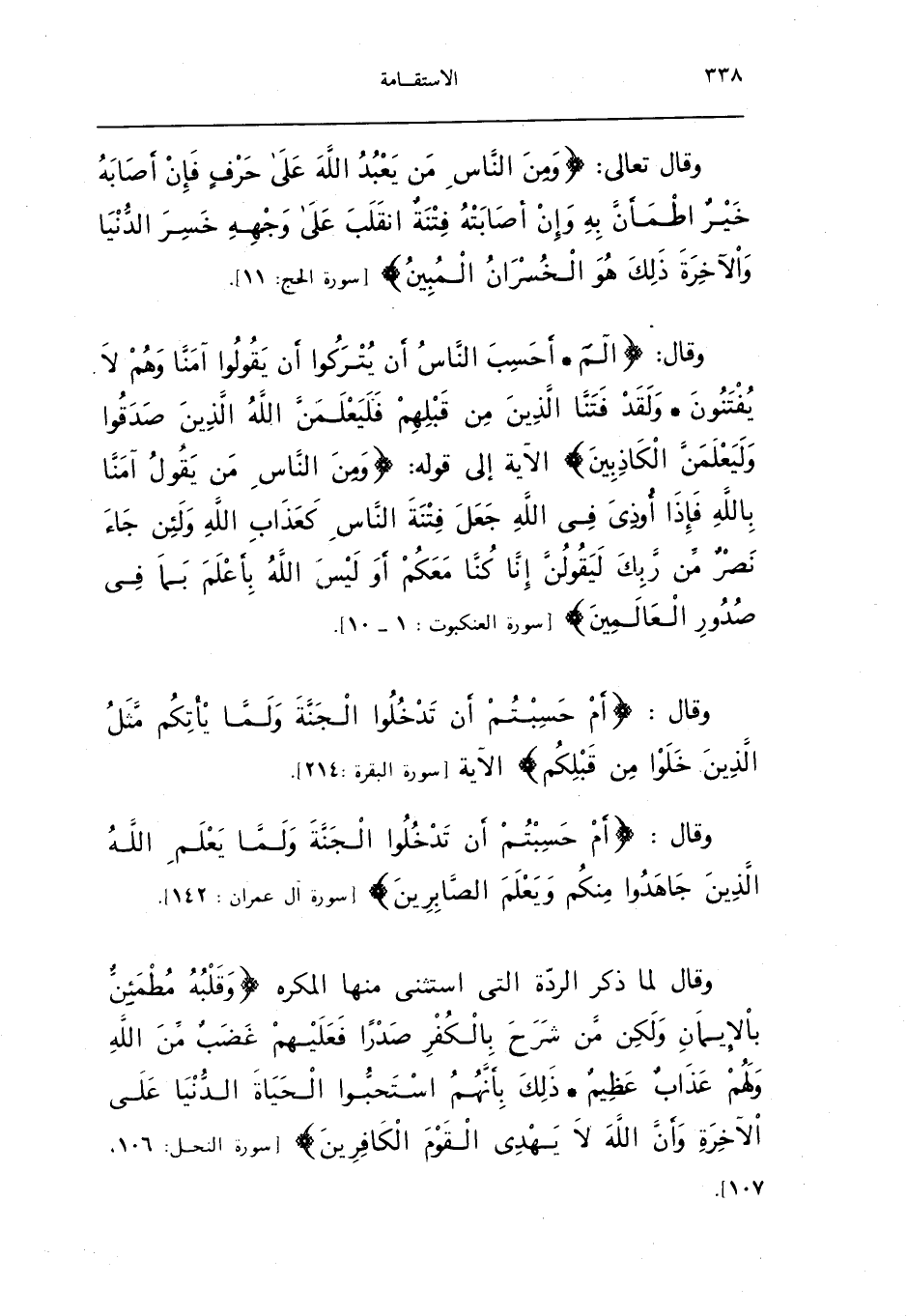 وَقَالَ تَعَالَى {وَمن النَّاس من يعبد الله على حرف فَإِن أَصَابَهُ خير اطْمَأَن بِهِ وَإِن أَصَابَته فتْنَة انْقَلب على وَجهه خسر الدُّنْيَا وَالْآخِرَة ذَلِك هُوَ الخسران الْمُبين} سُورَة الْحَج 11