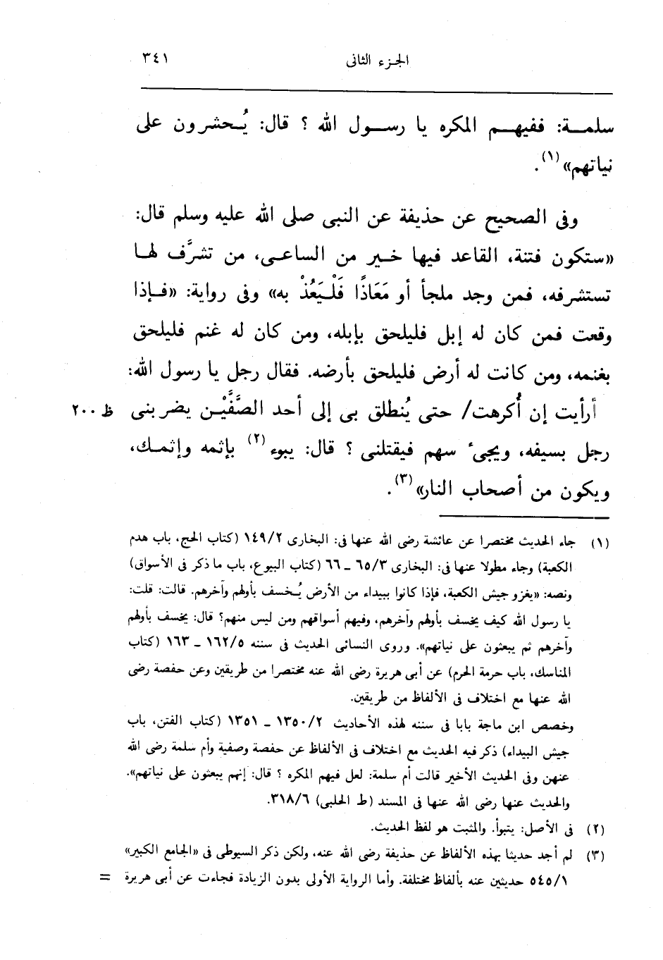 وَفِي الصَّحِيح عَن حُذَيْفَة عَن النَّبِي صلى الله عَلَيْهِ وَسلم قَالَ سَتَكُون فتْنَة الْقَاعِد فِيهَا خير من السَّاعِي من تشرف لَهَا تستشرفه فَمن وجد ملْجأ اَوْ معَاذًا فليعذ بِهِ وَفِي رِوَايَة فَإِذا وَقعت فَمن كَانَ لَهُ ابل فليلحق بإبله وَمن كَانَ لَهُ غنم فليلحق بغنمه وَمن كَانَت لَهُ ارْض فليلحق بأرضه فَقَالَ رجل يَا رَسُول الله أَرَأَيْت ان اكرهت حَتَّى ينْطَلق بِي الى اُحْدُ الصفين يضربني رجل بِسَيْفِهِ ويجئ سهم فَيَقْتُلنِي قَالَ يبوء بإثمه وإثمك وَيكون من اصحاب النَّار