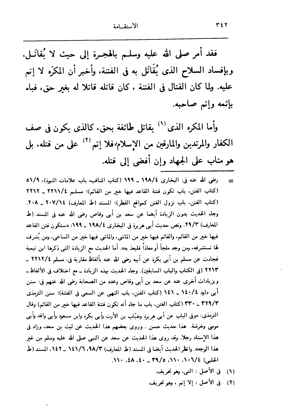 فقد امْر صلى الله عَلَيْهِ وَسلم بِالْهِجْرَةِ الى حَيْثُ لَا يُقَاتل وبإفساد السِّلَاح الَّذِي يُقَاتل بِهِ فِي الْفِتْنَة وَاخْبَرْ ان الْمُكْره لَا اثم عَلَيْهِ وَلما كَانَ الْقِتَال فِي الْفِتْنَة كَانَ قَاتله قَاتلا لَهُ بِغَيْر حق فباء بإثمه واثم صَاحبه
