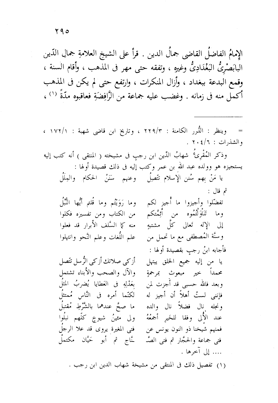 الإِمَام الْفَاضِل القَاضِي جمال الدّين قَرَأَ على الشَّيْخ الْعَلامَة جمال الدّين البابصري الْبَغْدَادِيّ وَغَيره وتفقه حَتَّى مهر فِي الْمَذْهَب وَأقَام السّنة وقمع الْبِدْعَة بِبَغْدَاد وأزال الْمُنْكَرَات وارتفع حَتَّى لم يكن فِي الْمَذْهَب أكمل مِنْهُ فِي زَمَانه وَغَضب عَلَيْهِ جمَاعَة من الرافضة فعاقبوه مُدَّة