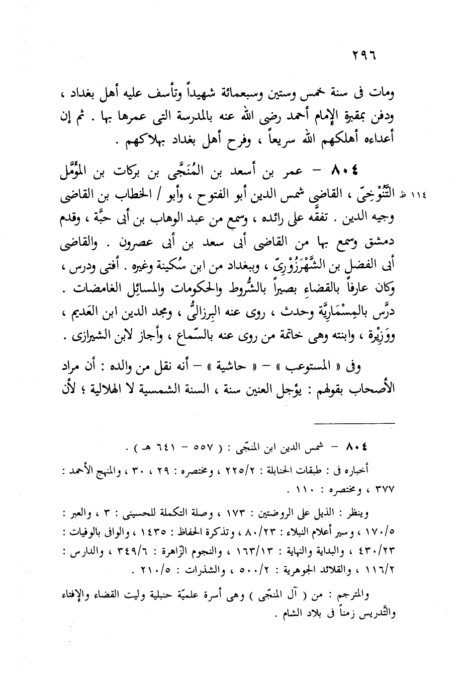 804 - عمر بن أسعد بن المنجي بن بَرَكَات بن المؤمل التنوخي القَاضِي شمس الدّين أَبُو الْفتُوح وَأَبُو الْخطاب بن القَاضِي وجيه الدّين تفقه على رائده وَسمع من عبد الْوَهَّاب بن أبي حَبَّة وَقدم دمشق وَسمع بهَا من القَاضِي أبي سعد بن أبي عصرون وَالْقَاضِي أبي الْفضل بن الشهرزوري وببغداد من ابْن سكينَة وَغَيره أفتى ودرس وَكَانَ عَارِفًا بِالْقضَاءِ بَصيرًا بِالشُّرُوطِ والحكومات والمسائل الغامضات درس بالمسمارية وَحدث روى عَنهُ البرزالي ومجد الدّين ابْن العديم ووزيرة وَابْنَته وَهِي خَاتِمَة من روى عَنهُ بِالسَّمَاعِ وَأَجَازَ لِابْنِ الشِّيرَازِيّ وَفِي الْمُسْتَوْعب حَاشِيَة أَنه نقل من وَالِده أَن مُرَاد الْأَصْحَاب بقَوْلهمْ يُؤَجل الْعنين سنة السّنة الشمسية لَا الْهِلَالِيَّة لِأَن