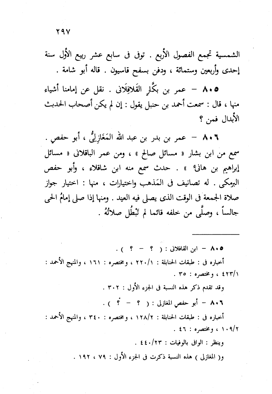 806 - عمر بن بدر بن عبد الله المغازلي أَبُو حَفْص سمع من ابْن بشار مسَائِل صَالح وَمن عمر الباقلاني مسَائِل إِبْرَاهِيم بن هانىء حدث سمع مِنْهُ ابْن شاقلاء وَأَبُو حَفْص الْبَرْمَكِي لَهُ تصانيف فِي الْمَذْهَب واختيارات مِنْهَا اخْتِيَار جَوَاز صَلَاة الْجُمُعَة فِي الْوَقْت الَّذِي يصلى فِيهِ الْعِيد وَمِنْهَا إِذا صلى إِمَام الْحَيّ جَالِسا وَصلى من خَلفه قَائِما لم تبطل صلَاته