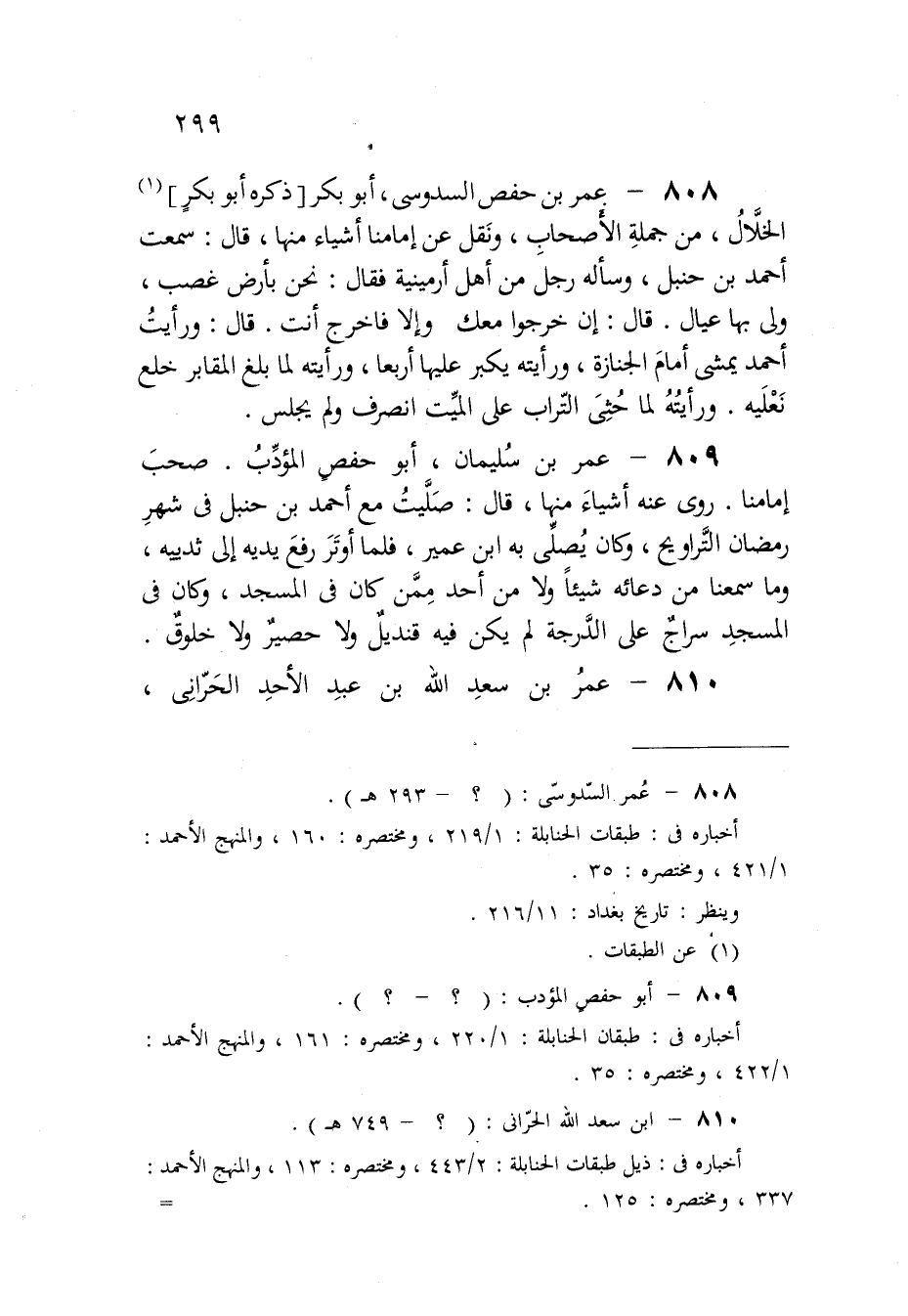 808 - عمر بن حَفْص السدُوسِي أَبُو بكر ذكره أَبُو بكر الْخلال من جملَة الْأَصْحَاب وَنقل عَن إمامنا أَشْيَاء مِنْهَا قَالَ سَمِعت أَحْمد بن حَنْبَل وَسَأَلَهُ رجل من أهل أرمينية فَقَالَ نَحن بِأَرْض غصب ولي بهَا عِيَال قَالَ إِن خَرجُوا مَعَك وَإِلَّا فَاخْرُج أَنْت قَالَ وَرَأَيْت أَحْمد يمشي أَمَام الْجِنَازَة ورأيته يكبر عَلَيْهَا أَرْبعا ورأيته لما بلغ الْمَقَابِر خلع نَعْلَيْه ورأيته لما حثى التُّرَاب على الْمَيِّت انْصَرف وَلم يجلس