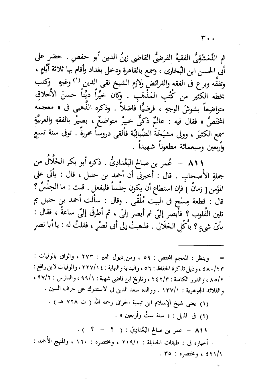 811 - عمر بن صَالح الْبَغْدَادِيّ ذكره أَبُو بكر الْخلال من جملَة الْأَصْحَاب قَالَ أَخْبرنِي أَن أَحْمد بن حَنْبَل قَالَ يَأْتِي على الْمُؤمن زمَان فَإِن اسْتَطَاعَ أَن يكون حلسا فَلْيفْعَل قلت مَا الحلس قَالَ قِطْعَة مسح فِي الْبَيْت ملقى وَقَالَ سَأَلت أَحْمد بن حَنْبَل بِمَ تلين الْقُلُوب فأبصر إِلَيّ ثمَّ أبْصر إِلَيّ ثمَّ أطرق إِلَى سَاعَة فَقَالَ بِأَيّ شَيْء بِأَكْل الْحَلَال فَذَهَبت إِلَى أبي نصر فَقلت لَهُ يَا أَبَا نصر