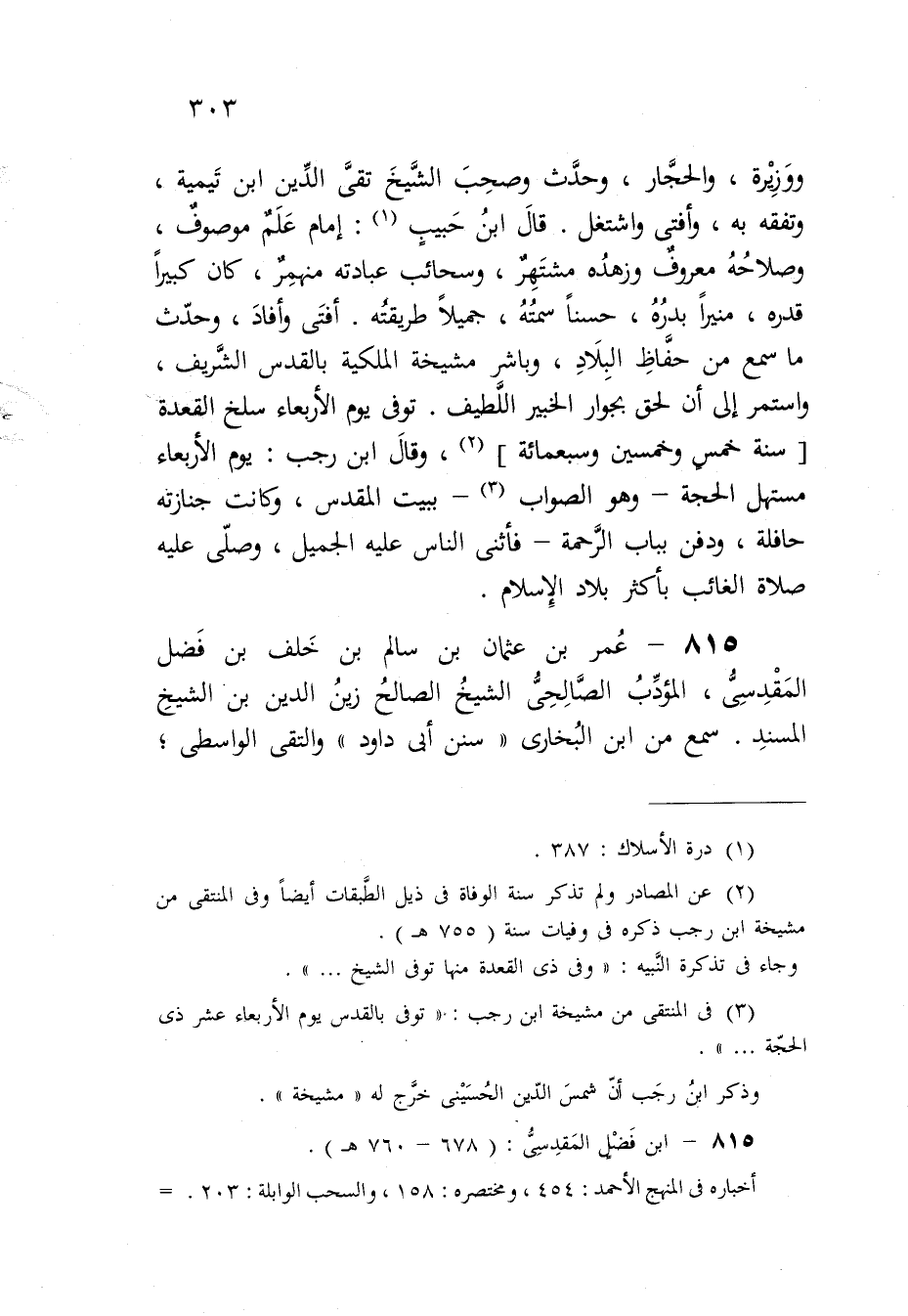 815 - عمر بن عُثْمَان بن سَالم بن خلف بن فضل الْمَقْدِسِي الْمُؤَدب الصَّالِحِي الشَّيْخ الصَّالح زين الدّين بن الشَّيْخ الْمسند سمع من ابْن البُخَارِيّ سنَن أبي دَاوُد والتقى الوَاسِطِيّ