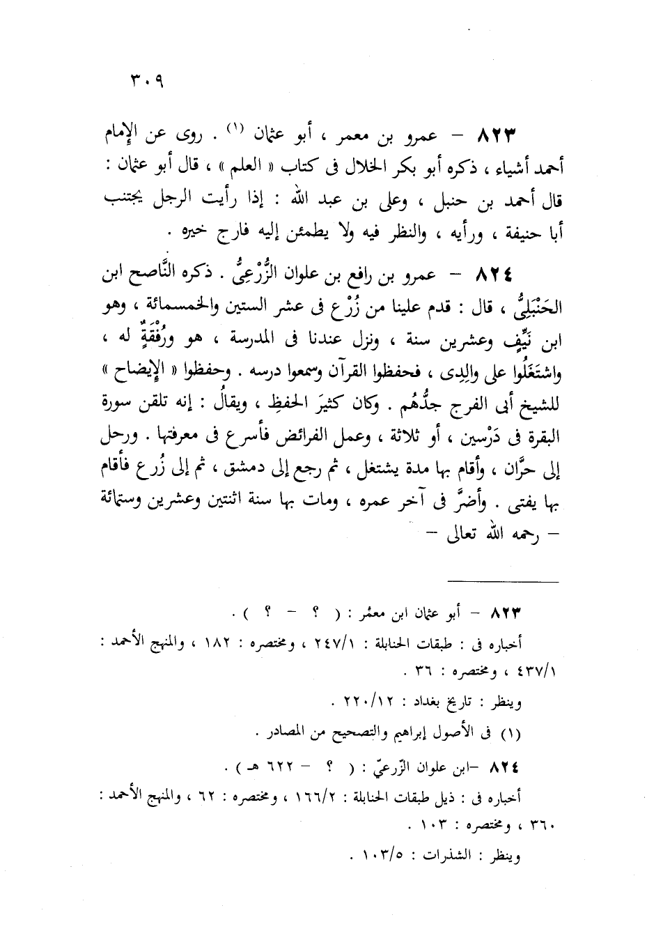824 - عَمْرو بن رَافع بن علوان الزرعى ذكره الناصح ابْن الْحَنْبَلِيّ قَالَ قدم علينا من زرع فِي عشر السِّتين والخمسمائة وَهُوَ ابْن نَيف وَعشْرين سنة وَنزل عندنَا فِي الْمدرسَة هُوَ ورفقة لَهُ وَاشْتَغلُوا على وَالِدي فحفظوا الْقُرْآن وسمعوا درسه وحفظوا الْإِيضَاح للشَّيْخ أبي الْفرج جدهم وَكَانَ كثير الْحِفْظ وَيُقَال إِنَّه تلقن سُورَة الْبَقَرَة فِي درسين أَو ثَلَاثَة وَعمل الْفَرَائِض فأسرع فِي مَعْرفَتهَا ورحل إِلَى حران وَأقَام بهَا مُدَّة يشْتَغل ثمَّ رَجَعَ إِلَى دمشق ثمَّ إِلَى زرع فَأَقَامَ بهَا يُفْتِي وأضر فِي آخر عمره وَمَات بهَا سنة اثْنَتَيْنِ وَعشْرين وسِتمِائَة رَحمَه الله تَعَالَى