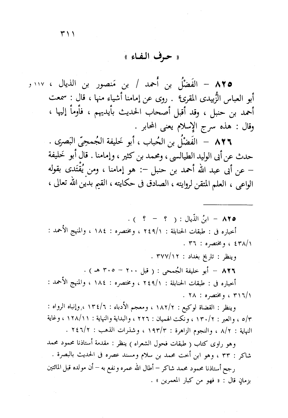 826 - الْفضل بن الْحباب أَبُو خَليفَة الجمحى الْبَصْرِيّ حدث عَن أبي الْوَلِيد الطَّيَالِسِيّ وَمُحَمّد بن كثير وإمامنا قَالَ أَبُو خَليفَة عَن أبي عبد الله أَحْمد بن حَنْبَل هُوَ إمامنا وَمن يقْتَدى بقوله الواعي الْعلم المتقن لروايته الصَّادِق فِي حكايته الْقيم بدين الله تَعَالَى