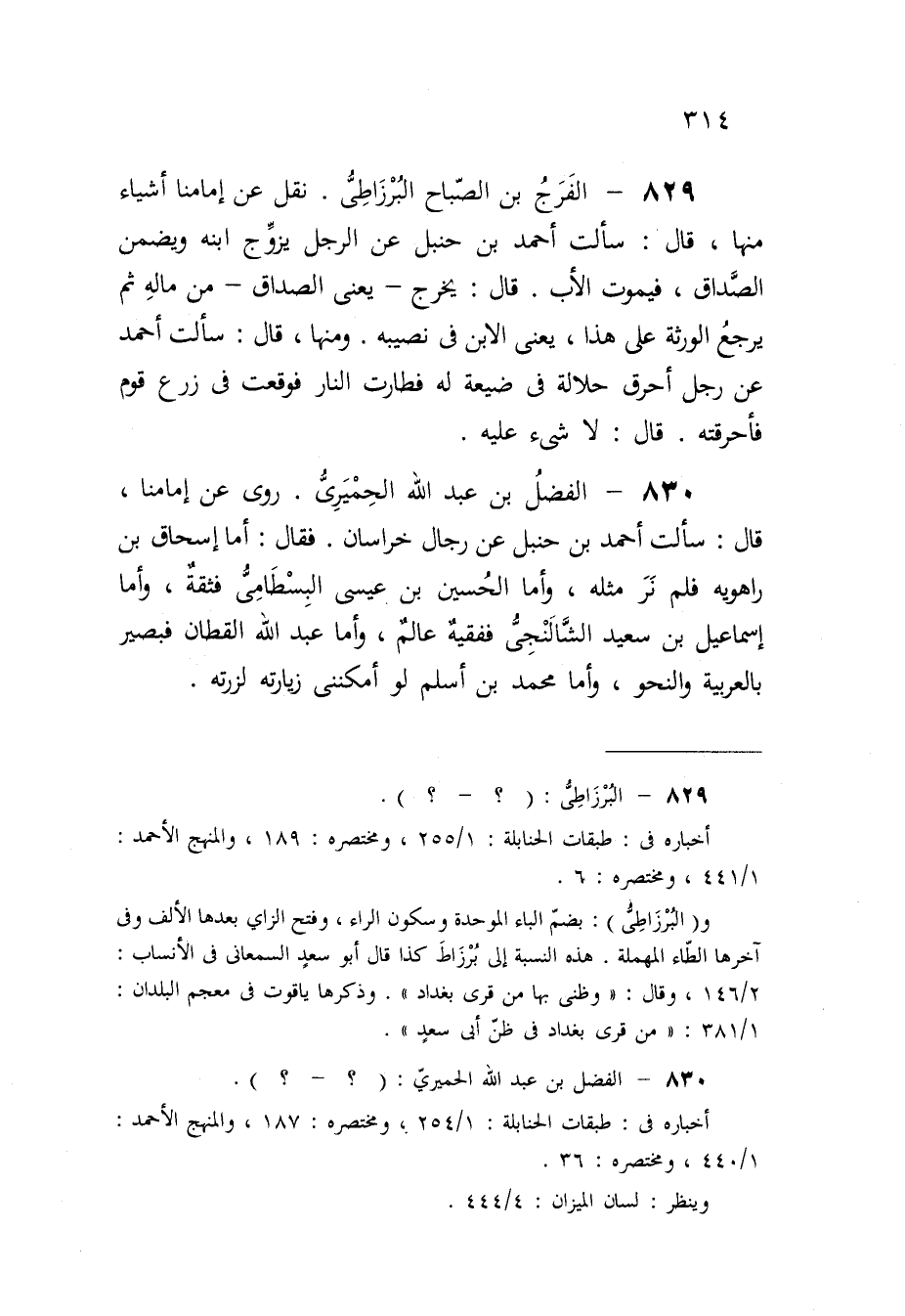 830 - الْفضل بن عبد الله الْحِمْيَرِي روى عَن إمامنا قَالَ سَأَلت أَحْمد بن حَنْبَل عَن رجال خُرَاسَان فَقَالَ أما إِسْحَاق بن رَاهْوَيْةِ فَلم نر مثله وَأما الْحُسَيْن بن عِيسَى البسطامي فَثِقَة وَأما إِسْمَاعِيل بن سعيد الشالنجي ففقيه عَالم وَأما عبد الله الْقطَّان فبصير بِالْعَرَبِيَّةِ والنحو وَأما مُحَمَّد بن أسلم لَو أمكنني زيارته لزرته