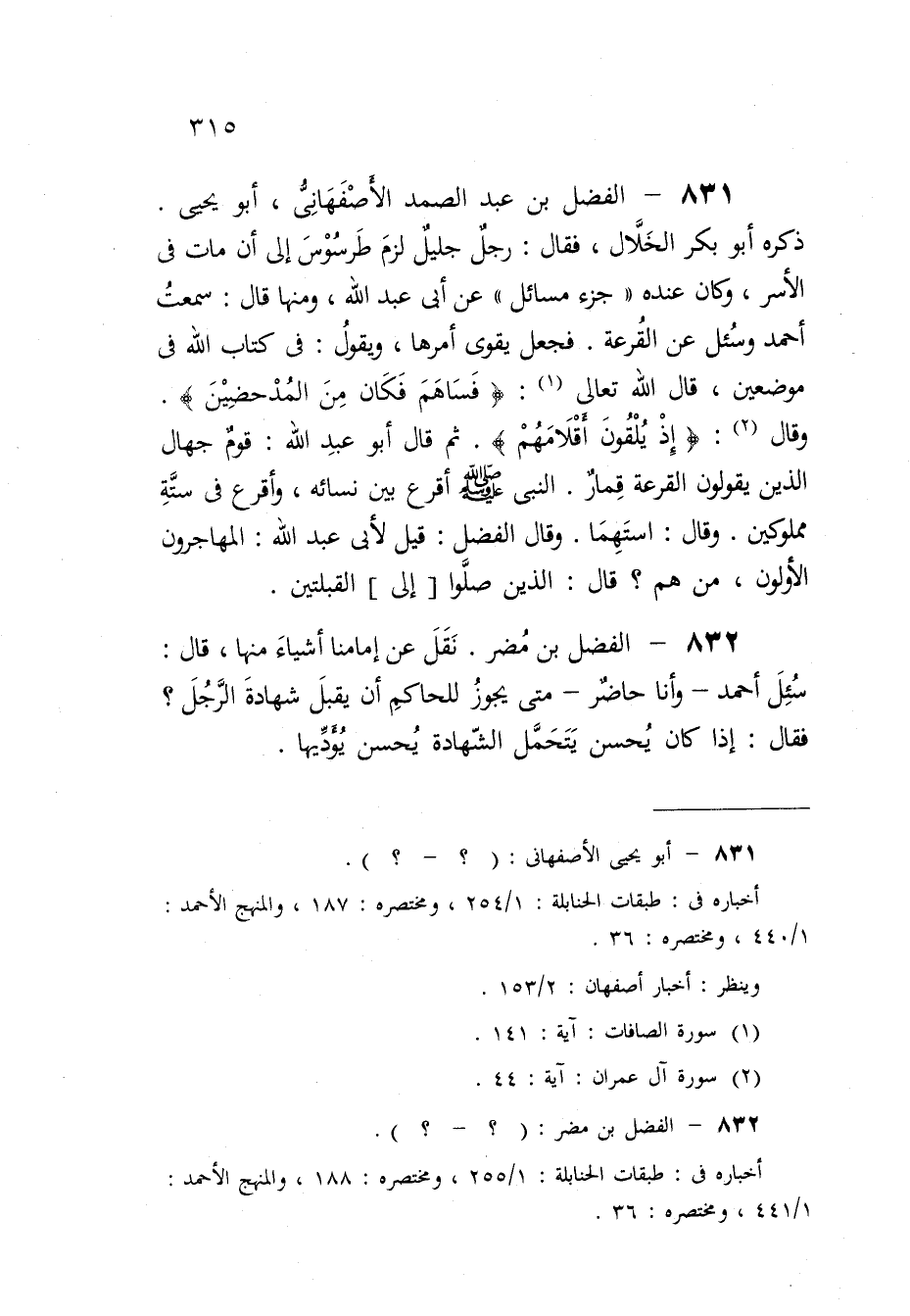 831 - الْفضل بن عبد الصَّمد الْأَصْفَهَانِي أَبُو يحيى ذكره أَبُو بكر الْخلال فَقَالَ رجل جليل لزم طرسوس إِلَى أَن مَاتَ فِي الْأسر وَكَانَ عِنْده جُزْء مسَائِل عَن أبي عبد الله وَمِنْهَا قَالَ سَمِعت أَحْمد وَسُئِلَ عَن الْقرعَة فَجعل يُقَوي أمرهَا وَيَقُول فِي كتاب الله فِي موضِعين قَالَ الله تَعَالَى (فساهم فَكَانَ من المدحضين) وَقَالَ (إِذْ يلقون أقلامهم) ثمَّ قَالَ أَبُو عبد الله قوم جهال الَّذين يَقُولُونَ الْقرعَة قمار النَّبِي أَقرع بَين نِسَائِهِ وأقرع فِي سِتَّة مملوكين وَقَالَ اسْتهمَا وَقَالَ الْفضل قيل لأبي عبد الله الْمُهَاجِرُونَ الْأَولونَ من هم قَالَ الَّذين صلوا إِلَى الْقبْلَتَيْنِ