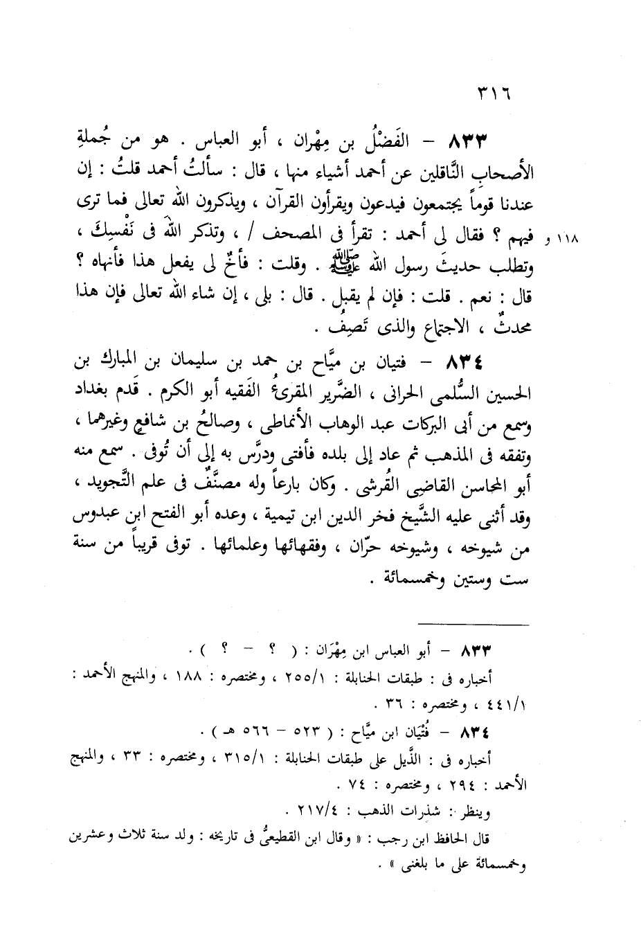 833 - الْفضل بن مهْرَان أَبُو الْعَبَّاس هُوَ من جملَة الْأَصْحَاب الناقلين عَن أَحْمد أَشْيَاء مِنْهَا قَالَ سَأَلت أَحْمد قلت إِن عندنَا قوما يَجْتَمعُونَ فَيدعونَ ويقرأون الْقُرْآن ويذكرون الله تَعَالَى فَمَا ترى فيهم فَقَالَ لي أَحْمد تقْرَأ فِي الْمُصحف وتذكر الله فِي نَفسك وتطلب حَدِيث رَسُول الله وَقلت فأخ لي يفعل هَذَا فأنهاه قَالَ نعم قلت فَإِن لم يقبل قَالَ بلَى إِن شَاءَ الله تَعَالَى فَإِن هَذَا مُحدث الِاجْتِمَاع وَالَّذِي تصف