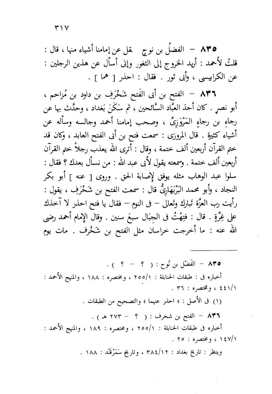 835 - الْفضل بن نوح نقل عَن إمامنا أَشْيَاء مِنْهَا قَالَ قلت لِأَحْمَد أُرِيد الْخُرُوج إِلَى الثغور وَإِنِّي أسَال عَن هذَيْن الرجلَيْن عَن الْكَرَابِيسِي وَأبي ثَوْر فَقَالَ احذر هما
