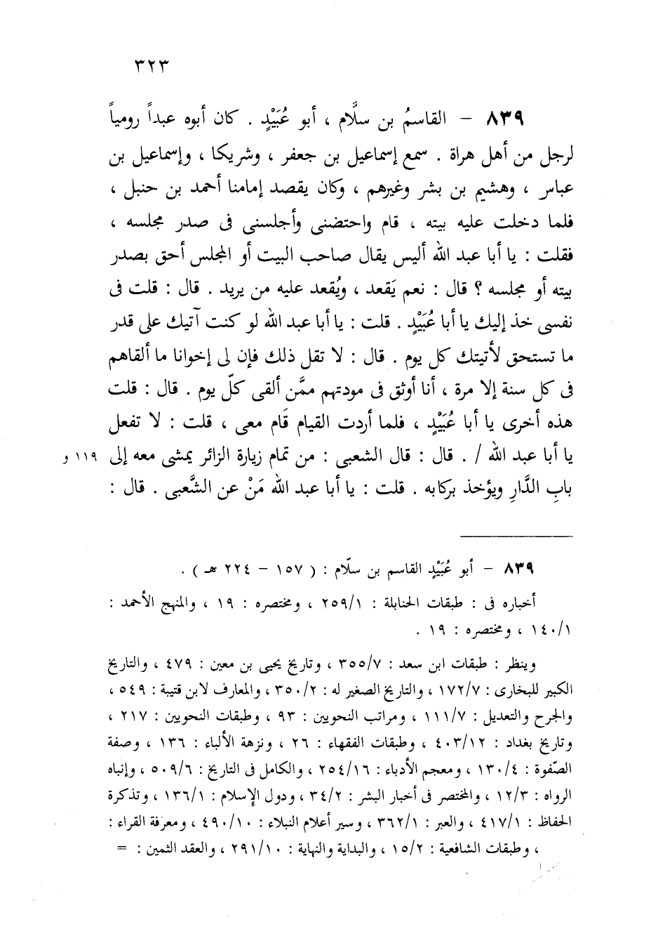 839 - الْقَاسِم بن سَلام أَبُو عبيد كَانَ أَبوهُ عبدا روميا لرجل من أهل هراة سمع إِسْمَاعِيل بن جَعْفَر وشريكا وَإِسْمَاعِيل بن عَبَّاس وهشيم بن بشر وَغَيرهم وَكَانَ يقْصد إمامنا أَحْمد بن حَنْبَل فَلَمَّا دخلت عَلَيْهِ بَيته قَامَ واحتضنى وأجلسني فِي صدر مَجْلِسه فَقلت يَا أَبَا عبد الله أَلَيْسَ يُقَال صَاحب الْبَيْت أَو الْمجْلس أَحَق بصدر بَيته أَو مَجْلِسه قَالَ نعم يقْعد وَيقْعد عَلَيْهِ من يُرِيد قَالَ قلت فِي نَفسِي خُذ إِلَيْك يَا أَبَا عبيد قلت يَا أَبَا عبد الله لَو كنت آتِيك على قدر مَا تسْتَحقّ لأتيتك كل يَوْم قَالَ لَا تقل ذَلِك فَإِن لي إخْوَانًا مَا ألقاهم فِي كل سنة إِلَّا مرّة أَنا أوثق فِي مَوَدَّتهمْ مِمَّن القى كل يَوْم قَالَ قلت هَذِه أُخْرَى يَا أَبَا عبيد فَلَمَّا أردْت الْقيام قَامَ معي قلت لَا تفعل يَا أَبَا عبد الله قَالَ قَالَ الشّعبِيّ من تَمام زِيَارَة الزائر يمشي مَعَه إِلَى بَاب الدَّار وَيُؤْخَذ بركابه قلت يَا أَبَا عبد الله من عَن الشّعبِيّ قَالَ