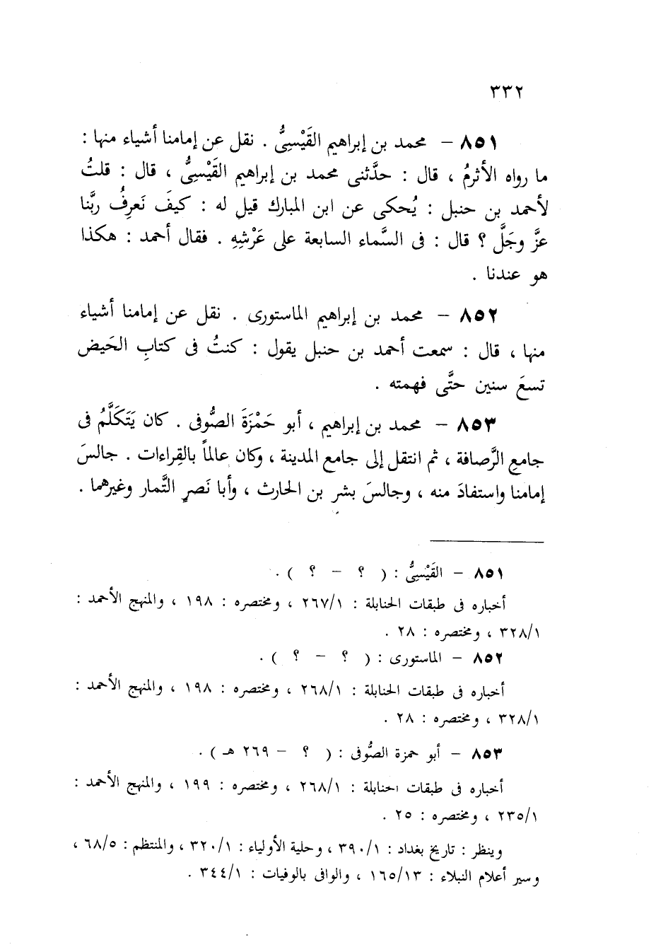 852 - مُحَمَّد بن إِبْرَاهِيم الماستوري نقل عَن إمامنا أَشْيَاء مِنْهَا قَالَ سَمِعت أَحْمد بن حَنْبَل يَقُول كنت فِي كتاب الْحيض تسع سِنِين حَتَّى فهمته
