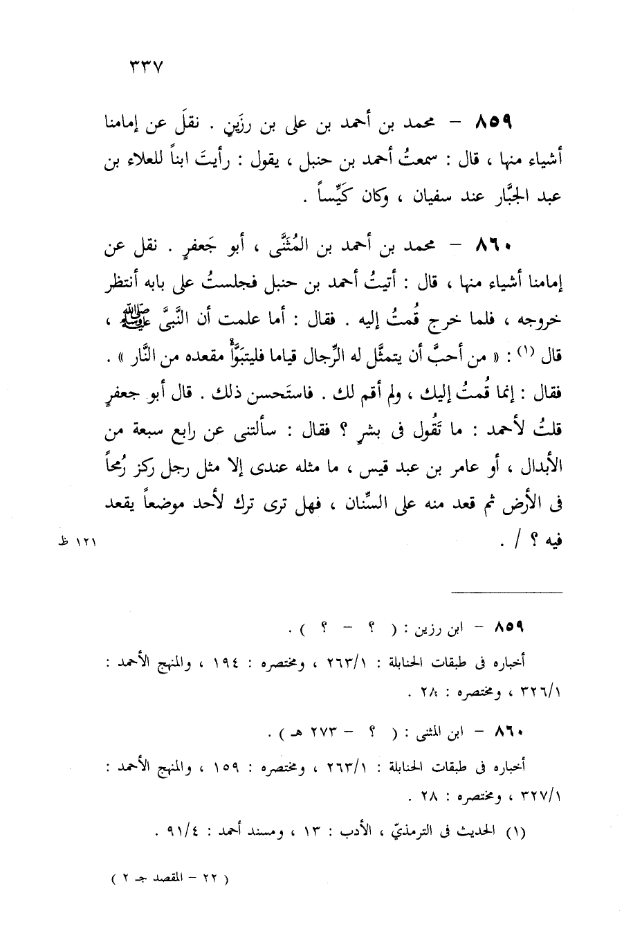 860 - مُحَمَّد بن أَحْمد بن الْمثنى أَبُو جَعْفَر نقل عَن إمامنا أَشْيَاء مِنْهَا قَالَ أتيت أَحْمد بن حَنْبَل فَجَلَست على بَابه أنْتَظر خُرُوجه فَلَمَّا خرج قُمْت إِلَيْهِ فَقَالَ أما علمت أَن النَّبِي قَالَ (من أحب أَن يتَمَثَّل لَهُ الرِّجَال قيَاما فَليَتَبَوَّأ مَقْعَده من النَّار) فَقَالَ إِنَّمَا قُمْت إِلَيْك وَلم أقِم لَك فَاسْتحْسن ذَلِك قَالَ أَبُو جَعْفَر قلت لِأَحْمَد مَا تَقول فِي بشر فَقَالَ سَأَلتنِي عَن رَابِع سَبْعَة من الأبدال أَو عَامر بن عبد قيس مَا مثله عِنْدِي إِلَّا مثل رجل ركز رمحا فِي الأَرْض ثمَّ قعد مِنْهُ على السنان فَهَل ترى ترك لأحد موضعا يقْعد فِيهِ