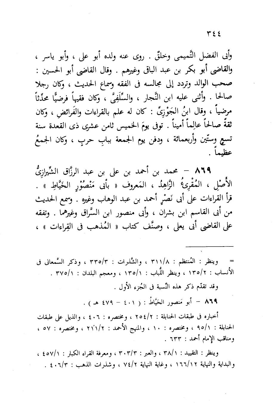 869 - مُحَمَّد بن أَحْمد بن عَليّ بن عبد الرَّزَّاق الشِّيرَازِيّ الأَصْل المقرىء الزَّاهِد الْمَعْرُوف بِأبي مَنْصُور الْخياط قَرَأَ الْقرَاءَات على أبي نصر أَحْمد بن عبد الْوَهَّاب وَغَيره وَسمع الحَدِيث من أبي الْقَاسِم ابْن بَشرَان وَأبي مَنْصُور ابْن السراق وَغَيرهمَا وتفقه على القَاضِي ابي يعلى وصنف كتاب الْمَذْهَب فِي الْقرَاءَات