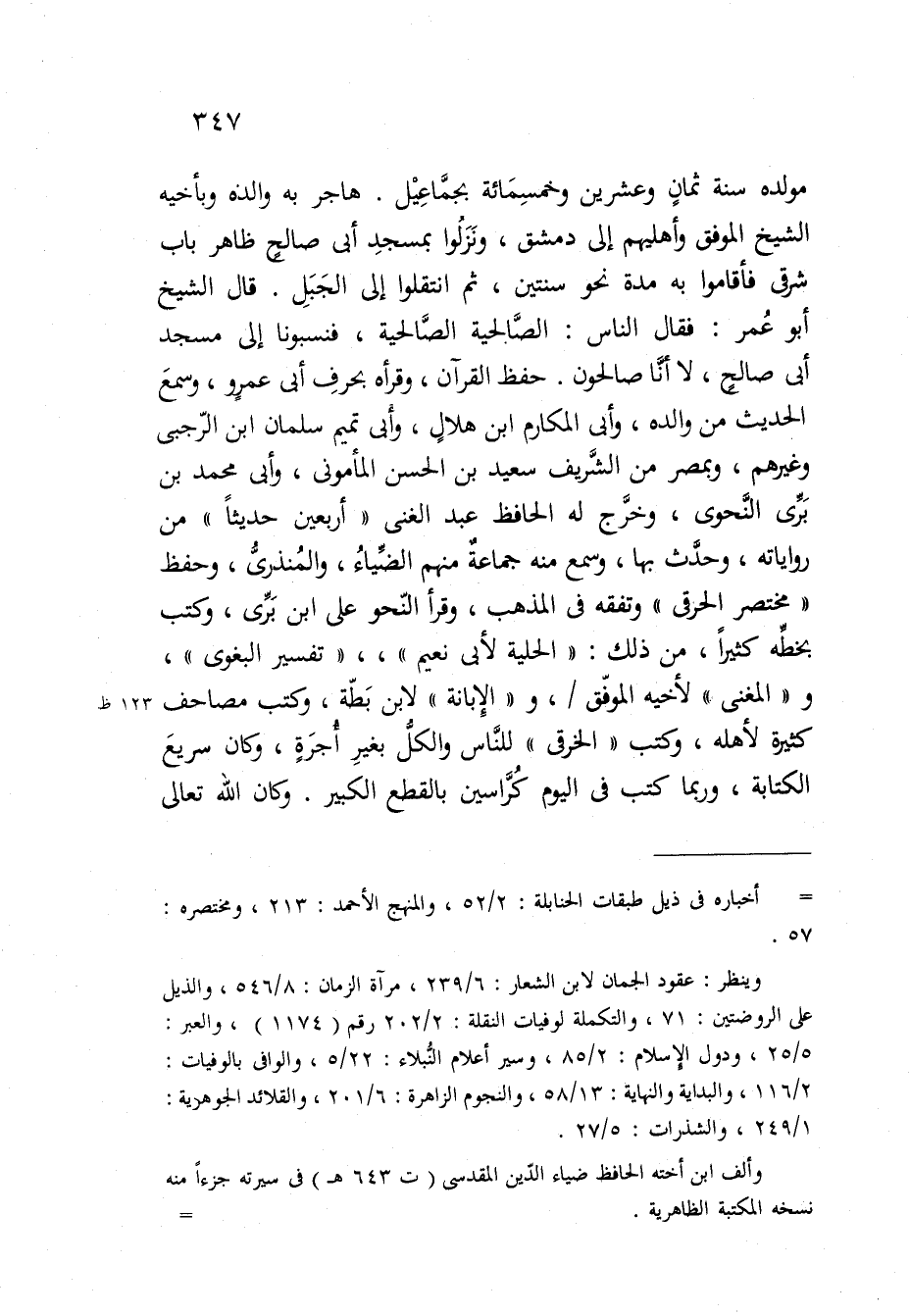 مولده سنة ثَمَان وَعشْرين وَخَمْسمِائة بجماعيل هَاجر بِهِ وَالِده وبأخيه الشَّيْخ الْمُوفق وأهليهم إِلَى دمشق ونزلوا بِمَسْجِد أبي صَالح ظَاهر بَاب شَرْقي فأقاموا بِهِ مُدَّة نَحْو سنتَيْن ثمَّ انتقلوا إِلَى الْجَبَل قَالَ الشَّيْخ أَبُو عمر فَقَالَ النَّاس الصالحية الصالحية فنسبونا إِلَى مَسْجِد أبي صَالح لَا أَنا صَالِحُونَ