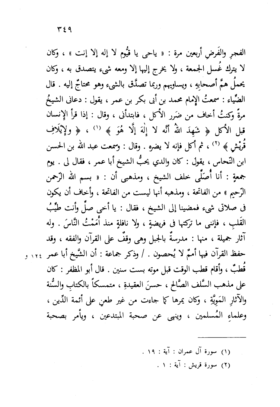 وَذكر جمَاعَة أَن الشَّيْخ أَبَا عمر قطب وَأقَام قطب الْوَقْت قبل مَوته بست سِنِين قَالَ أَبُو المظفر كَانَ على مَذْهَب السّلف الصَّالح حسن العقيدة متمسكا بِالْكتاب وَالسّنة والْآثَار الموية وَكَانَ يمرها كَمَا جَاءَت من غير طعن على أَئِمَّة الدّين وعلماء الْمُسلمين وَينْهى عَن صُحْبَة المبتدعين وَيَأْمُر بِصُحْبَة