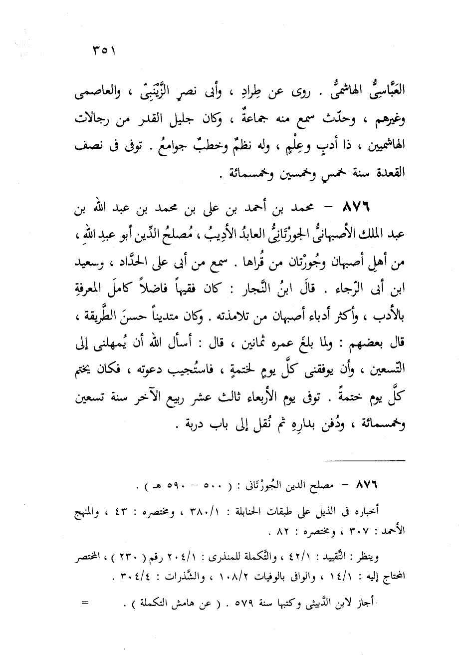 876 - مُحَمَّد بن أَحْمد بن عَليّ بن مُحَمَّد بن عبد الله بن عبد الْملك الْأَصْبَهَانِيّ الجورتاني العابد الأديب مصلح الدّين أَبُو عبد الله من أهل أَصْبَهَان وجورتان من قراها سمع من أبي عَليّ الْحداد وَسَعِيد ابْن أبي الرَّجَاء قَالَ ابْن النجار كَانَ فَقِيها فَاضلا كَامِل الْمعرفَة بالأدب وَأكْثر أدباء أَصْبَهَان من تلامذته وَكَانَ متدينا حسن الطَّرِيقَة قَالَ بَعضهم وَلما بلغ عمره ثَمَانِينَ قَالَ أسأَل الله أَن يمهلني إِلَى التسعين وَأَن يوفقني كل يَوْم لختمة فاستجيب دَعوته فَكَانَ يخْتم كل يَوْم ختمة