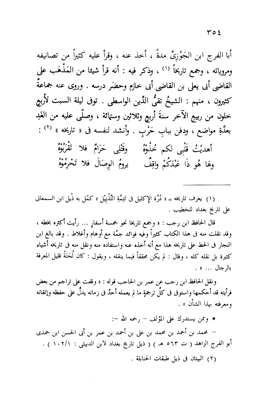 أَبَا الْفرج ابْن الْجَوْزِيّ مُدَّة أَخذ عَنهُ وَقَرَأَ عَلَيْهِ كثيرا من تصانيفه ومروياته وَجمع تَارِيخا وَذكر فِيهِ أَنه قَرَأَ شَيْئا من الْمَذْهَب على القَاضِي أبي يعلى بن القَاضِي أبي خازم وَحضر درسه