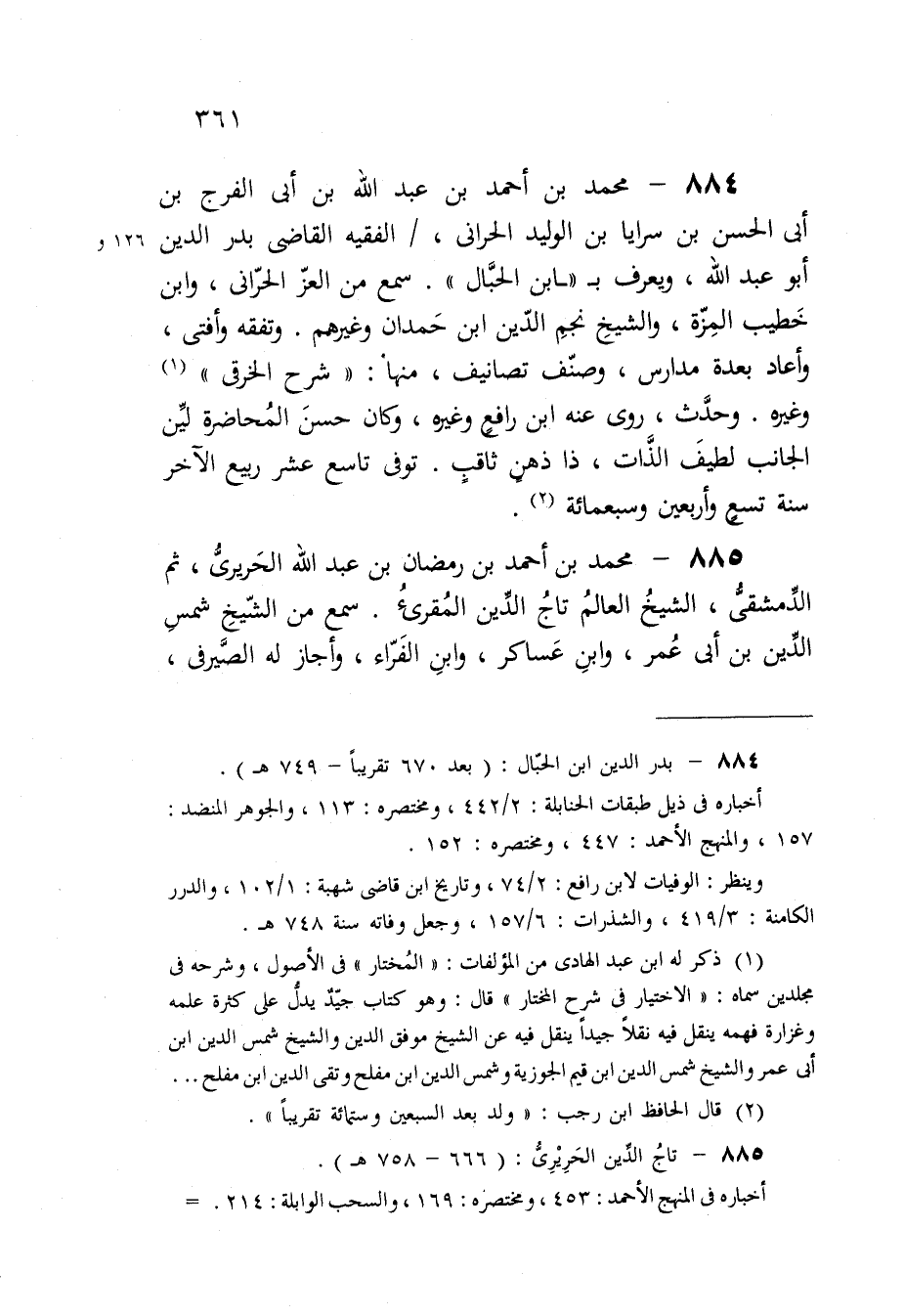 884 - مُحَمَّد بن أَحْمد بن عبد الله بن أبي الْفرج بن أبي الْحسن بن سَرَايَا بن الْوَلِيد الْحَرَّانِي الْفَقِيه القَاضِي بدر الدّين أَبُو عبد الله وَيعرف بِابْن الحبال سمع من الْعِزّ الْحَرَّانِي وَابْن خطيب المزة وَالشَّيْخ نجم الدّين ابْن حمدَان وَغَيرهم وتفقه وَأفْتى وَأعَاد بعدة مدارس وصنف تصانيف مِنْهَا شرح الخرقى وَغَيره وَحدث روى عَنهُ ابْن رَافع وَغَيره وَكَانَ حسن المحاضرة لين الْجَانِب لطيف الذَّات ذَا ذهن ثاقب توفّي تَاسِع عشر ربيع الآخر سنة تسع وَأَرْبَعين وَسَبْعمائة