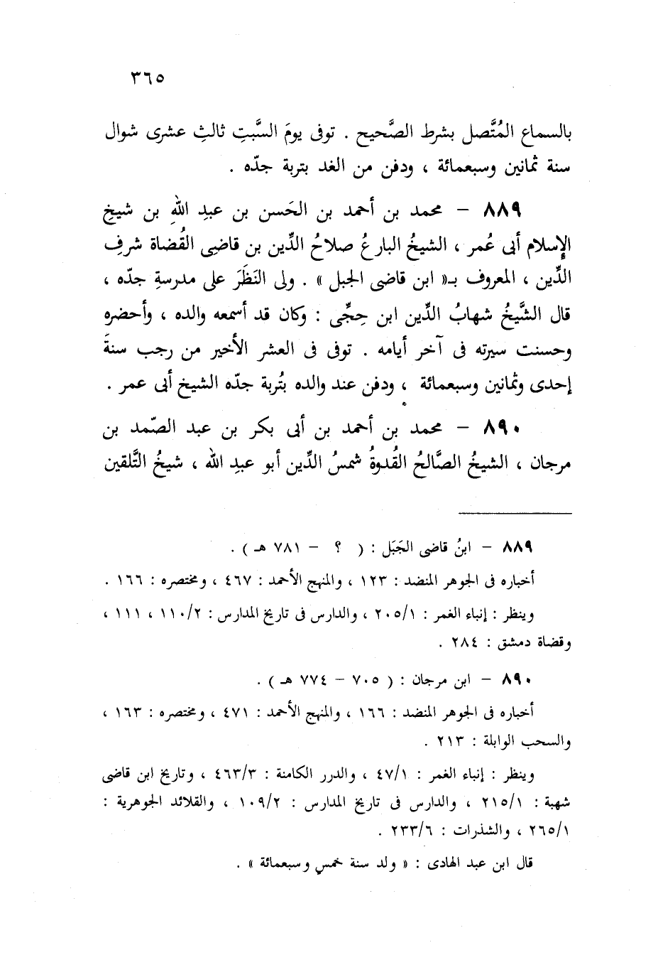 889 - مُحَمَّد بن أَحْمد بن الْحسن بن عبد الله بن شيخ الْإِسْلَام أبي عمر الشَّيْخ البارع صَلَاح الدّين بن قَاضِي الْقُضَاة شرف الدّين الْمَعْرُوف بِابْن قَاضِي الْجَبَل ولى النّظر على مدرسة جده قَالَ الشَّيْخ شهَاب الدّين ابْن حجى وَكَانَ قد أسمعهُ وَالِده وأحضره وَحسنت سيرته فِي آخر أَيَّامه توفّي فِي الْعشْر الْأَخير من رَجَب سنة إِحْدَى وَثَمَانِينَ وَسَبْعمائة وَدفن عِنْد وَالِده بتربة جده الشَّيْخ أبي عمر