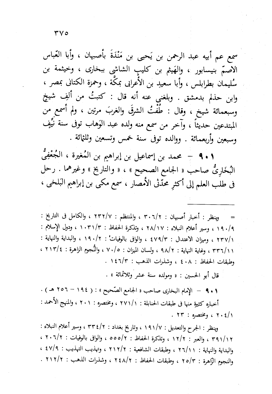 901 - مُحَمَّد بن إِسْمَاعِيل بن إِبْرَاهِيم بن الْمُغيرَة الْجعْفِيّ البُخَارِيّ صَاحب الْجَامِع الصَّحِيح والتاريخ وَغَيرهمَا رَحل فِي طلب الْعلم إِلَى أَكثر محدثي الْأَمْصَار سمع مكي بن إِبْرَاهِيم الْبَلْخِي
