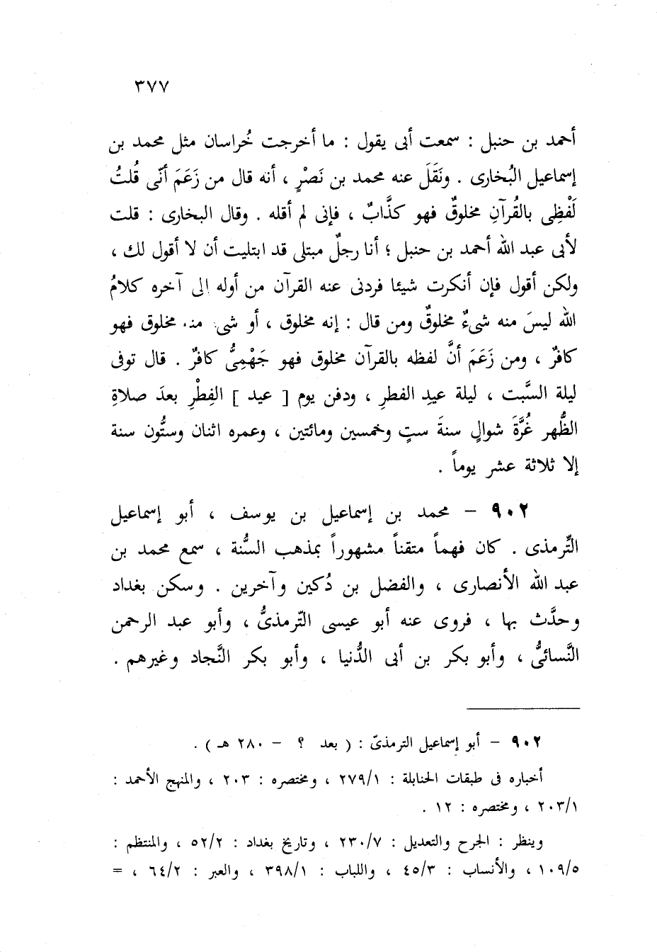 902 - مُحَمَّد بن إِسْمَاعِيل بن يُوسُف أَبُو إِسْمَاعِيل التِّرْمِذِيّ كَانَ فهما متقنا مَشْهُورا بِمذهب السّنة سمع مُحَمَّد بن عبد الله الْأنْصَارِيّ وَالْفضل بن دُكَيْن وَآخَرين وَسكن بَغْدَاد وَحدث بهَا فروى عَنهُ أَبُو عِيسَى التِّرْمِذِيّ وَأَبُو عبد الرَّحْمَن النَّسَائِيّ وَأَبُو بكر بن أبي الدُّنْيَا وَأَبُو بكر النجاد وَغَيرهم