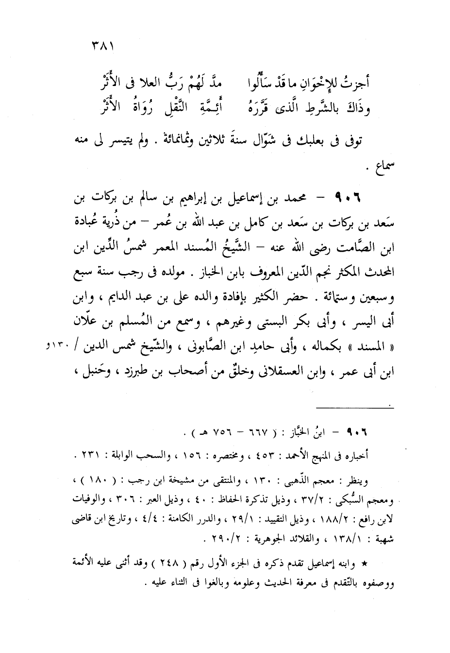 906 - مُحَمَّد بن إِسْمَاعِيل بن إِبْرَاهِيم بن سَالم بن بَرَكَات بن سعد بن بَرَكَات بن سعد بن كَامِل بن عبد الله بن عمر من ذُرِّيَّة عبَادَة ابْن الصَّامِت رَضِي الله عَنهُ الشَّيْخ الْمسند المعمر شمس الدّين ابْن الْمُحدث المكثر نجم الدّين الْمَعْرُوف بِابْن الخباز مولده فِي رَجَب سنة سبع وَسبعين وسِتمِائَة