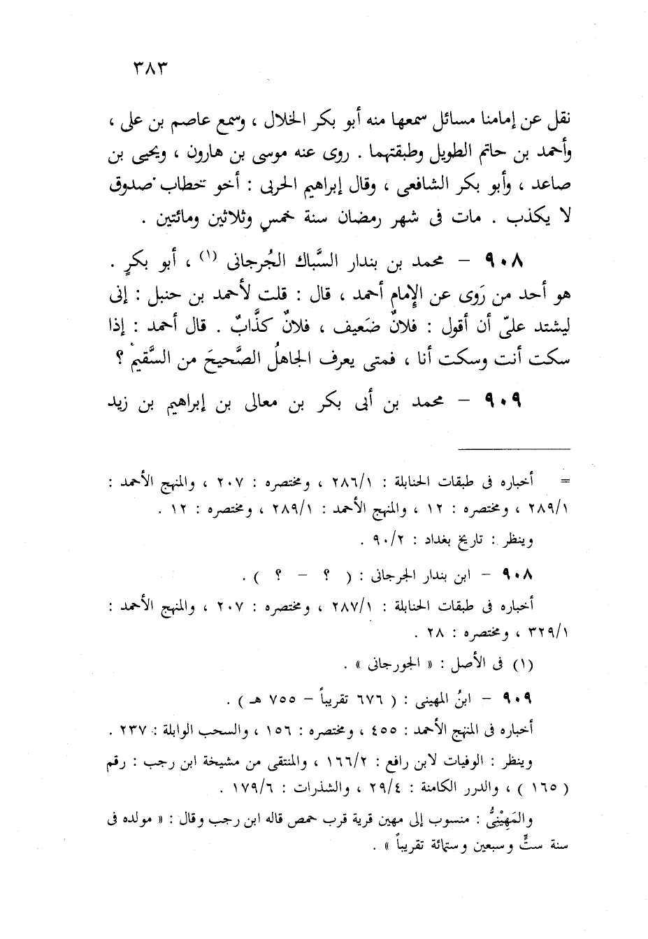 908 - مُحَمَّد بن بنْدَار السباك الْجِرْجَانِيّ أَبُو بكر هُوَ أحد من روى عَن الإِمَام أَحْمد قَالَ قلت لِأَحْمَد بن حَنْبَل إِنِّي ليشتد على أَن أَقُول فلَان ضَعِيف فلَان كَذَّاب قَالَ أَحْمد إِذا سكت أَنْت وَسكت أَنا فَمَتَى يعرف الْجَاهِل الصَّحِيح من السقيم