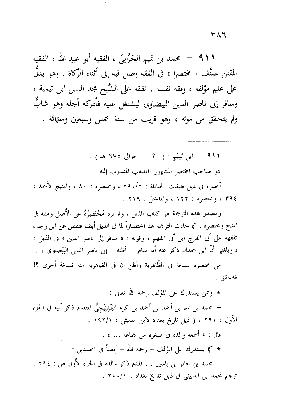 911 - مُحَمَّد بن تَمِيم الْحَرَّانِي الْفَقِيه أَبُو عبد الله الْفَقِيه المقنن صنف مُخْتَصرا فِي الْفِقْه وصل فِيهِ إِلَى أثْنَاء الزَّكَاة وَهُوَ يدل على علم مُؤَلفه وَفقه نَفسه