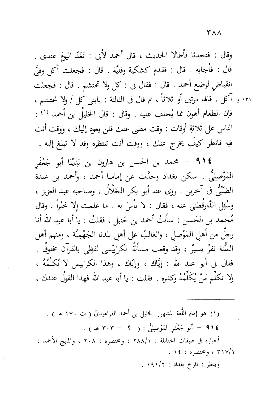 وَقَالَ فتحدثا فأطالا الحَدِيث قَالَ أَحْمد لأبي تغد الْيَوْم عِنْدِي قَالَ فَأَجَابَهُ قَالَ فَقدم كشكية وقلية قَالَ فَجعلت آكل وفى انقباض لوضع أَحْمد قَالَ فَقَالَ لي كل وَلَا تحتشم قَالَ فَجعلت آكل قَالَهَا مرَّتَيْنِ أَو ثَلَاثًا ثمَّ قَالَ فِي الثَّالِثَة يَا بني كل وَلَا تحتشم فَإِن الطَّعَام أَهْون مِمَّا يحلف عَلَيْهِ وَقَالَ قَالَ الْخَلِيل بن أَحْمد النَّاس على ثَلَاثَة أَوْقَات وَقت مضى عَنْك فَلَنْ يعود إِلَيْك وَوقت أَنْت فِيهِ فَانْظُر كَيفَ يخرج عَنْك وَوقت أَنْت تتنظره وَقد لَا تبلغ إِلَيْهِ