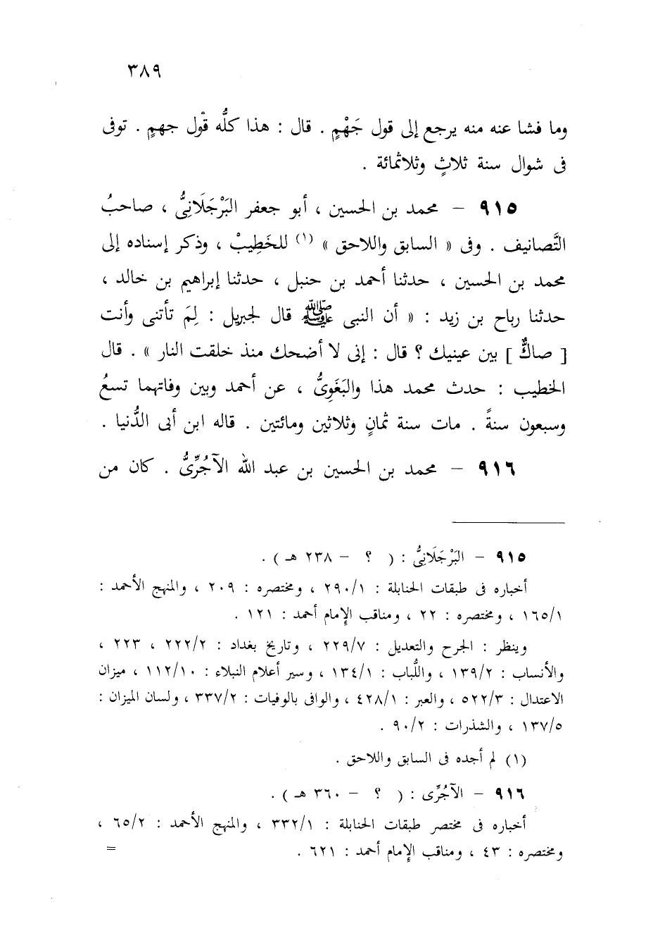 915 - مُحَمَّد بن الْحُسَيْن أَبُو جَعْفَر البرجلاني صَاحب التصانيف وَفِي السَّابِق واللاحق للخطيب وَذكر إِسْنَاده إِلَى مُحَمَّد بن الْحُسَيْن حَدثنَا أَحْمد بن حَنْبَل حَدثنَا إِبْرَاهِيم بن خَالِد حَدثنَا رَبَاح بن زيد أَن النَّبِي قَالَ لجبريل لم تأتني وَأَنت صاك بَين عَيْنَيْك قَالَ إِنِّي لَا أضْحك مُنْذُ خلقت النَّار قَالَ الْخَطِيب حدث مُحَمَّد هَذَا وَالْبَغوِيّ عَن أَحْمد وَبَين وفاتهما تسع وَسَبْعُونَ سنة مَاتَ سنة ثَمَان وَثَلَاثِينَ وَمِائَتَيْنِ قَالَه ابْن أبي الدُّنْيَا