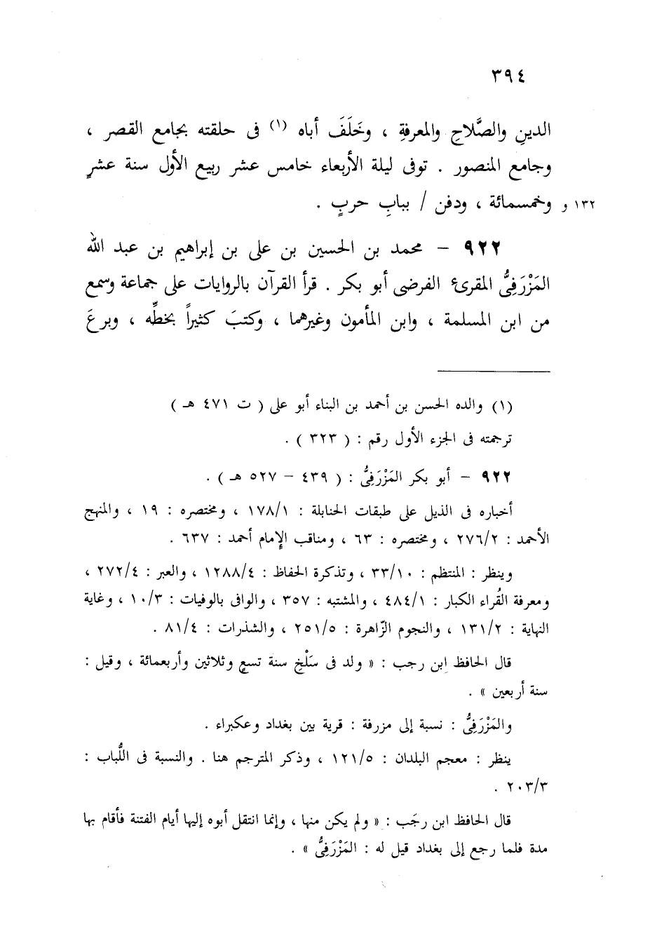 922 - مُحَمَّد بن الْحُسَيْن بن عَليّ بن إِبْرَاهِيم بن عبد الله المزرقي المقرىء الفرضي أَبُو بكر قَرَأَ الْقُرْآن بالروايات على جمَاعَة وَسمع من ابْن الْمسلمَة وَابْن الْمَأْمُون وَغَيرهمَا وَكتب كثيرا بِخَطِّهِ وبرع