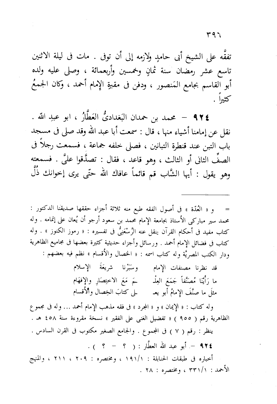 924 - مُحَمَّد بن حمدَان الْبَغْدَادِيّ الْعَطَّار أَبُو عبد الله نقل عَن إمامنا أَشْيَاء مِنْهَا قَالَ سَمِعت أَبَا عبد الله وَقد صلى فِي مَسْجِد بَاب التِّبْن عِنْد قنطرة التبانين فصلى خَلفه جمَاعَة فَسمِعت رجلا فِي الصَّفّ الثَّانِي أَو الثَّالِث وَهُوَ قَاعد فَقَالَ تصدقوا على فَسَمعته وَهُوَ يَقُول أَيهَا الشَّاب قُم قَائِما عافاك الله حَتَّى يرى إخوانك ذل