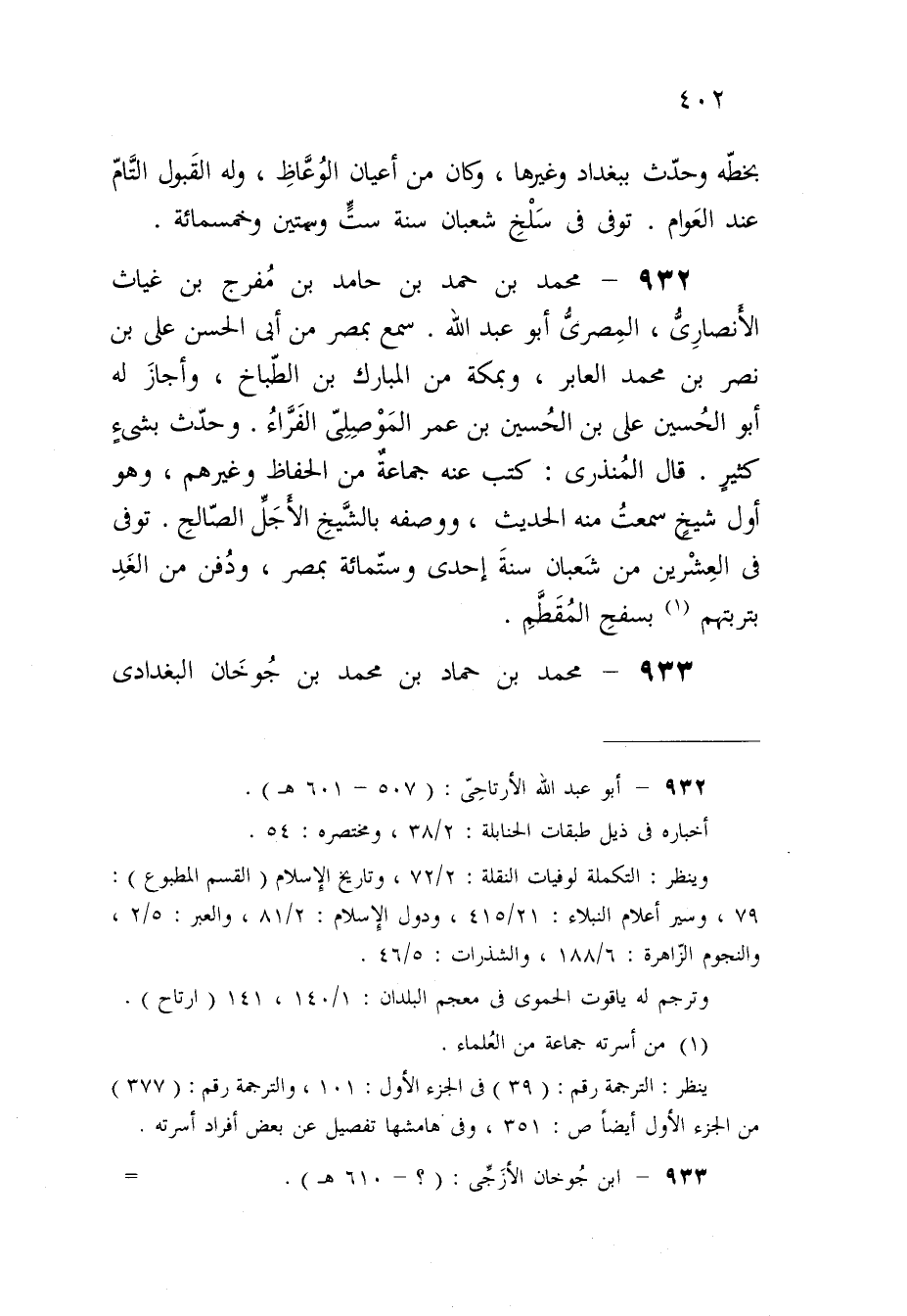 932 - مُحَمَّد بن حمد بن حَامِد بن مفرج بن غياث الْأنْصَارِيّ الْمصْرِيّ أَبُو عبد الله سمع بِمصْر من أبي الْحسن عَليّ بن نصر بن مُحَمَّد العابر وبمكة من الْمُبَارك بن الطباخ وَأَجَازَ لَهُ أَبُو الْحُسَيْن عَليّ بن الْحُسَيْن بن عمر الْموصِلِي الْفراء وَحدث بِشَيْء كثير قَالَ الْمُنْذِرِيّ كتب عَنهُ جمَاعَة من الْحفاظ وَغَيرهم وَهُوَ أول شيخ سَمِعت مِنْهُ الحَدِيث وَوَصفه بالشيخ الْأَجَل الصَّالح توفّي فِي الْعشْرين من شعْبَان سنة إِحْدَى وسِتمِائَة بِمصْر وَدفن من الْغَد بتربتهم بسفح المقطم