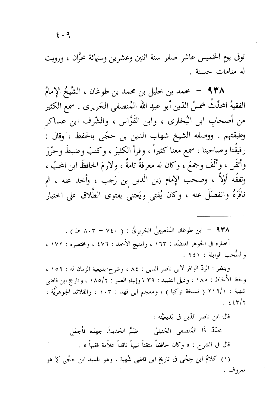 938 - مُحَمَّد بن خَلِيل بن مُحَمَّد بن طوغان الشَّيْخ الإِمَام الْفَقِيه الْمُحدث شمس الدّين أَبُو عبد الله المنصفى الحريرى سمع الْكثير من أَصْحَاب ابْن البُخَارِيّ وَابْن القواس والشرف ابْن عَسَاكِر وطبقتهم وَوَصفه الشَّيْخ شهَاب الدّين بن حجى بِالْحِفْظِ وَقَالَ رفيقنا وصاحبنا سمع مَعنا كثيرا وَقَرَأَ الْكثير وَكتب وَضبط وحرر وأتقن وَألف وَجمع وَكَانَ لَهُ معرفَة تَامَّة ولازم الْحَافِظ ابْن الْمُحب وتفقه أَولا وَصَحب الإِمَام زين الدّين بن رَجَب وَأخذ عَنهُ ثمَّ نافره وانفصل عَنهُ وَكَانَ يُفْتى ويعتني بفتوى الطَّلَاق على اخْتِيَار