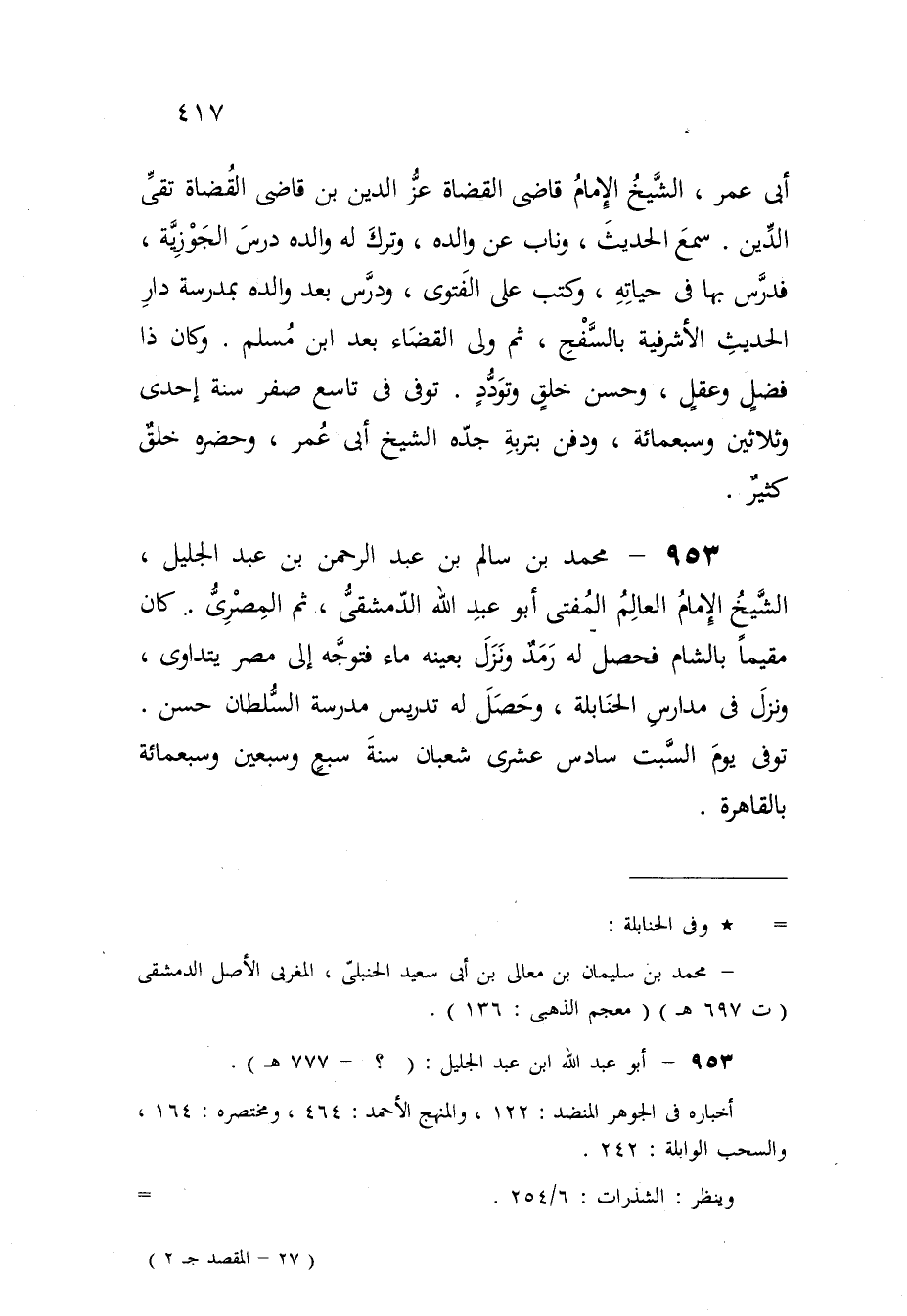 953 - مُحَمَّد بن سَالم بن عبد الرَّحْمَن بن عبد الْجَلِيل الشَّيْخ الإِمَام الْعَالم الْمُفْتى أَبُو عبد الله الدِّمَشْقِي ثمَّ الْمصْرِيّ