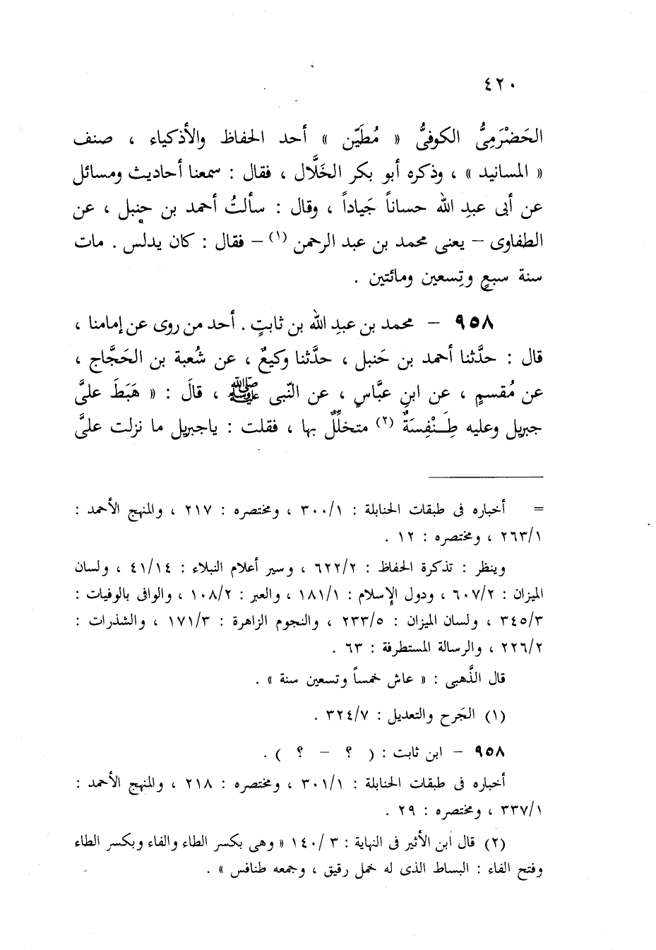 958 - مُحَمَّد بن عبد الله بن ثَابت أحد من روى عَن إمامنا قَالَ حَدثنَا أَحْمد بن حَنْبَل حَدثنَا وَكِيع عَن شُعْبَة بن الْحجَّاج عَن مقسم عَن ابْن عَبَّاس عَن النَّبِي قَالَ (هَبَط عَليّ جِبْرِيل وَعَلِيهِ طنفسة متخلل بهَا فَقلت يَا جِبْرِيل مَا نزلت على
