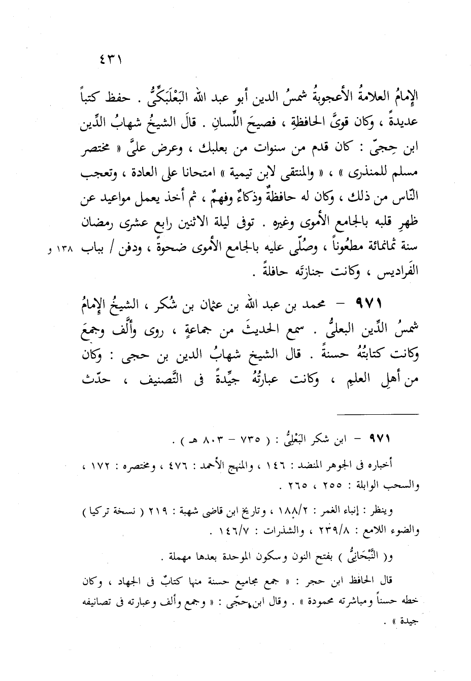 971 - مُحَمَّد بن عبد الله بن عُثْمَان بن شكر الشَّيْخ شمس الدّين البعلي سمع الحَدِيث من جمَاعَة روى وَألف وَجمع وَكَاتب كِتَابَته حَسَنَة