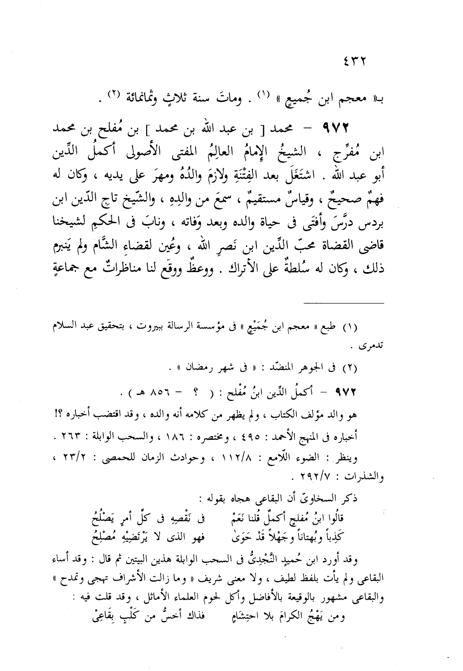 972 - مُحَمَّد بن عبد الله بن مُحَمَّد بن مُفْلِح بن مُحَمَّد ابْن مفرج الشَّيْخ الإِمَام الْعَالم الْمُفْتِي الأصولي أكمل الدّين أَبُو عبد الله اشْتغل بعد الْفِتْنَة ولازم وَالِده وَمهر على يَدَيْهِ وَكَانَ لَهُ فهم صَحِيح وَقِيَاس مُسْتَقِيم سمع من وَالِده وَالشَّيْخ تَاج الدّين ابْن بردس درس وَأفْتى فِي حَيَاة وَالِده وَبعد وَفَاته وناب فِي الحكم لشَيْخِنَا قَاضِي الْقُضَاة محب الدّين ابْن نصر الله وَعين لقَضَاء الشَّام وَلم ينبرم ذَلِك وَكَانَ لَهُ سلطة على الأتراك وَوعظ وَوَقع لنا مناظرات مَعَ جمَاعَة