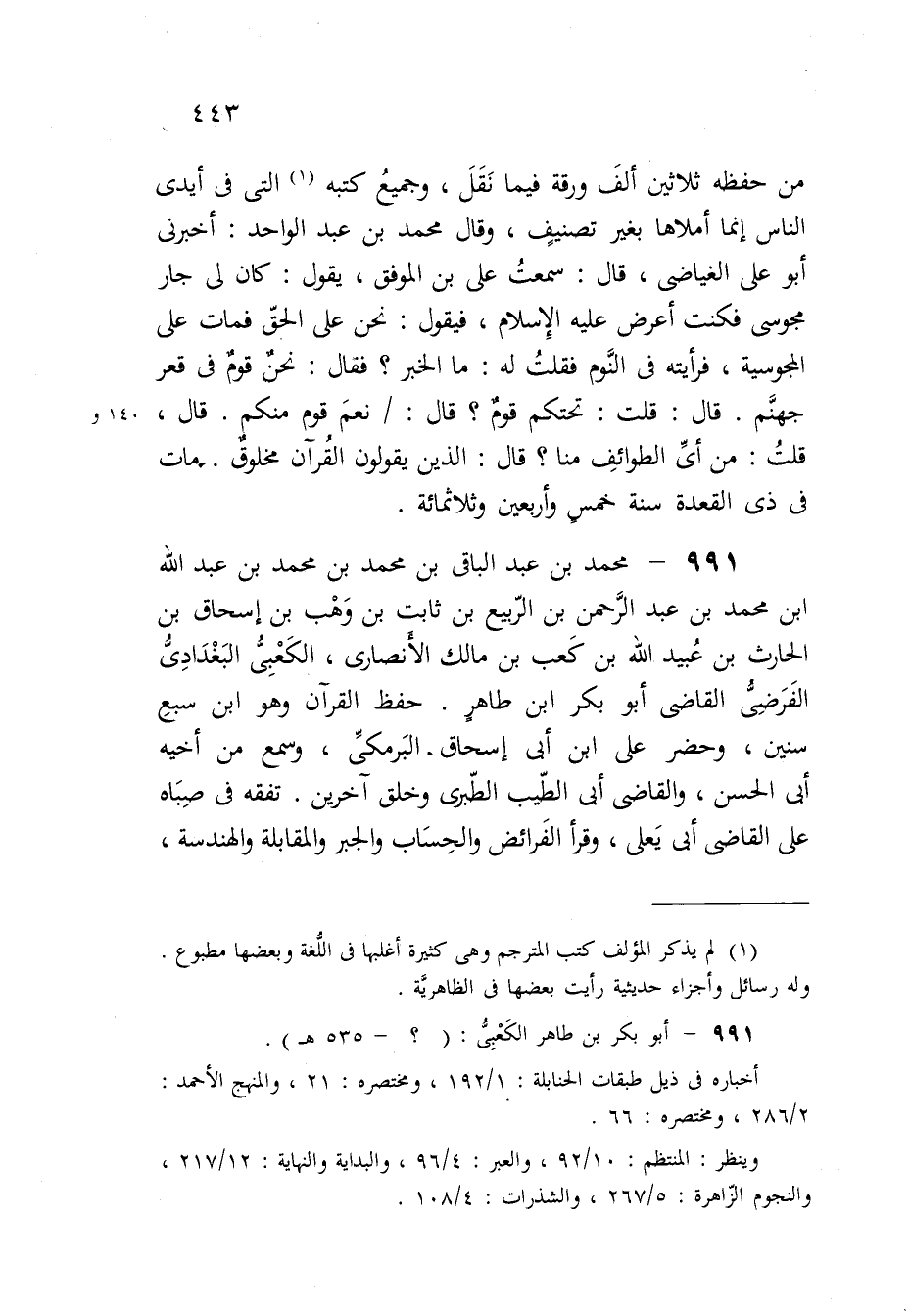 991 - مُحَمَّد بن عبد الْبَاقِي بن مُحَمَّد بن مُحَمَّد بن عبد الله ابْن مُحَمَّد بن عبد الرَّحْمَن بن الرّبيع بن ثَابت بن وهب بن إِسْحَاق بن الْحَارِث بن عبيد الله بن كَعْب بن مَالك الْأنْصَارِيّ الكعبي الْبَغْدَادِيّ الفرضي القَاضِي أَبُو بكر ابْن طَاهِر حفظ الْقُرْآن وَهُوَ ابْن سبع سِنِين وَحضر على ابْن ابي إِسْحَاق الْبَرْمَكِي وَسمع من أَخِيه أبي الْحسن وَالْقَاضِي أبي الطّيب الطَّبَرِيّ وَخلق آخَرين تفقه فِي صباه على القَاضِي أبي يعلى وَقَرَأَ الْفَرَائِض والحساب والجبر والمقابلة والهندسة