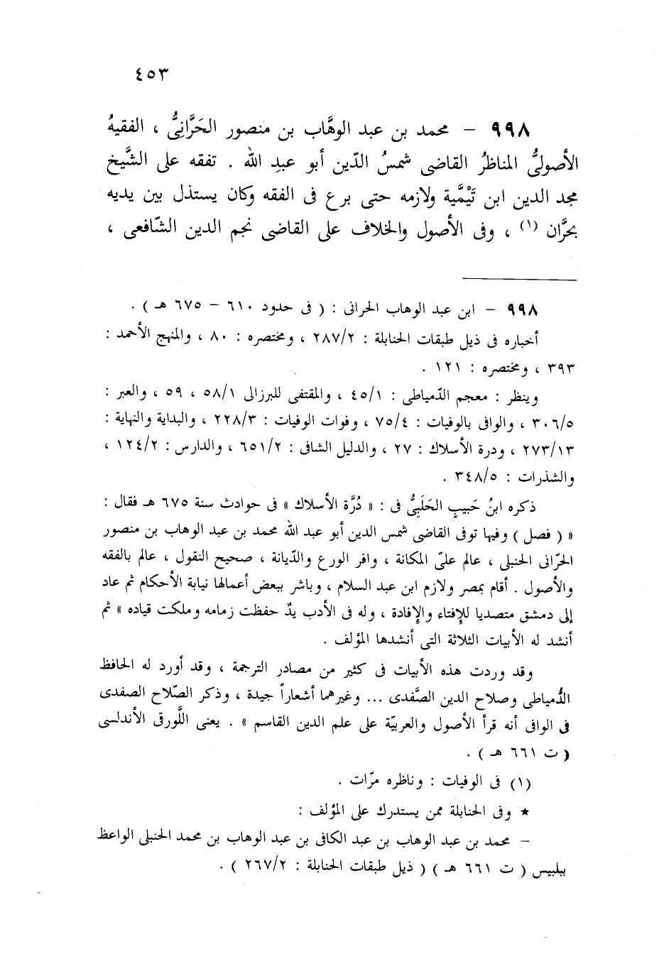 998 - مُحَمَّد بن عبد الْوَهَّاب بن مَنْصُور الْحَرَّانِي الْفَقِيه الأصولي المناظر القَاضِي شمس الدّين أَبُو عبد الله تفقه على الشَّيْخ مجد الدّين ابْن تَيْمِية ولازمه حَتَّى برع فِي الْفِقْه وَكَانَ يستذل بَين يَدَيْهِ بحران وَفِي الْأُصُول وَالْخلاف على القَاضِي نجم الدّين الشَّافِعِي